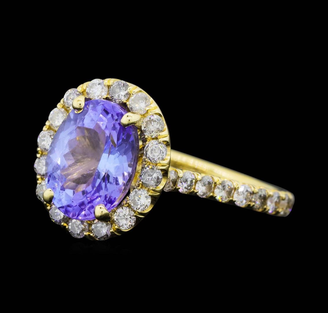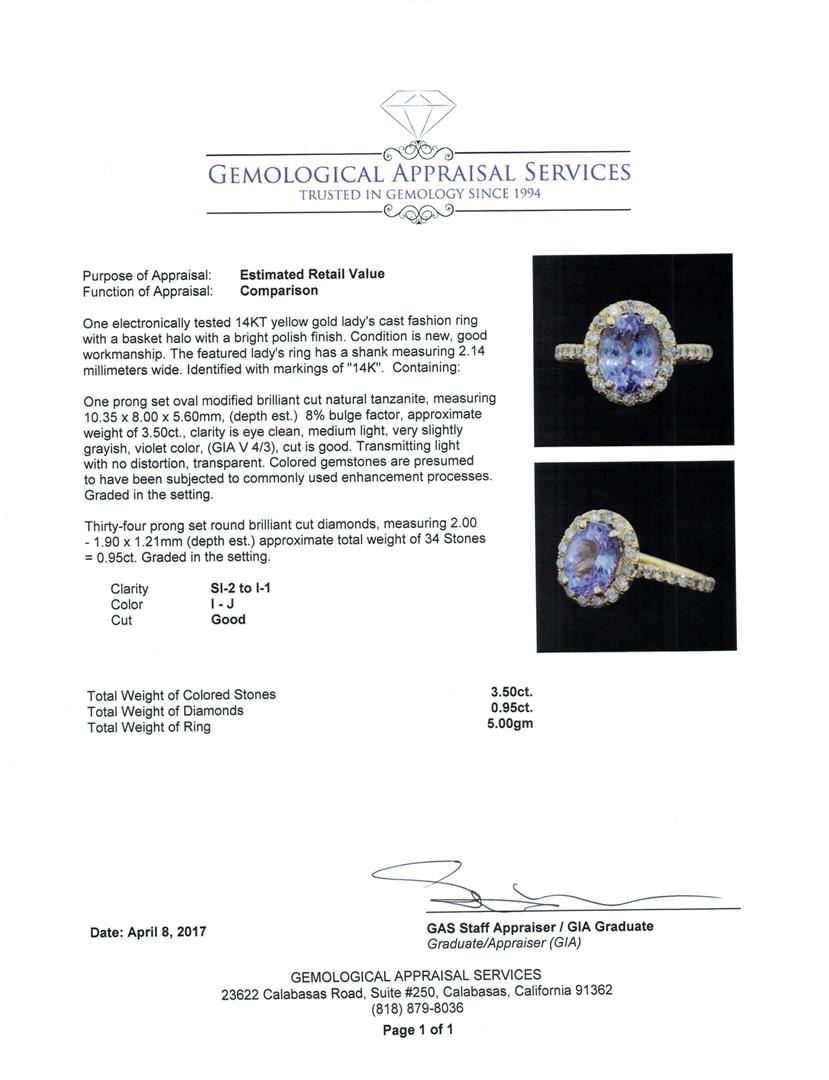 One electronically tested 14KT yellow gold lady's cast fashion ring with a basket halo with a bright polish finish. The featured lady's ring has a shank measuring 2.14 millimeters wide. Identified with markings of "14K". Condition is new, good workmanship. Containing: One prong set oval modified brilliant cut natural tanzanite, measuring 10.35 x 8.00 x 5.60mm, (depth est.) 8%. bulge factor, approximate weight of 3.50ct., clarity is eye clean, medium light, very slightly grayish, violet color, (GIA V 4/3), cut is good. Transmitting light with no distortion, transparent. Colored gemstones are presumed to have been subjected to commonly used enhancement processes. Graded in the setting. Thirty-Four prong set round brilliant cut diamonds, measuring 2.00 - 1.90 x 1.21mm (depth est.) approximate total weight of 34 Stones = 0.95ct. Graded in the setting. Color I - JClarity SI-2 to I-1 Cut Good. Total Weight of Colored Stones 3.50ct. Total Weight of Diamonds 0.95ct. Total Weight of Ring 5.00gm. GAS Appraised.