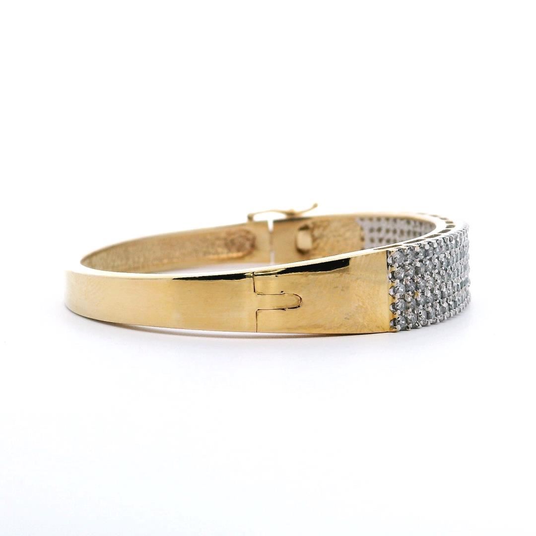 This beautifully crafted 14KT yellow gold diamond bangle bracelet features 170 round brilliant cut diamonds totaling 3.50 carats. Measuring 6.75 inches, it is secured with a tongue clasp and foldover safety. Designed with a bright polished finish, this bracelet offers a versatile, stylish option for both everyday wear and special occasions. Estimated Retail Value: $15,800.
