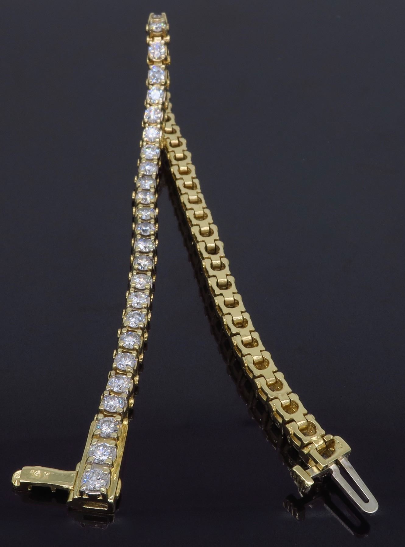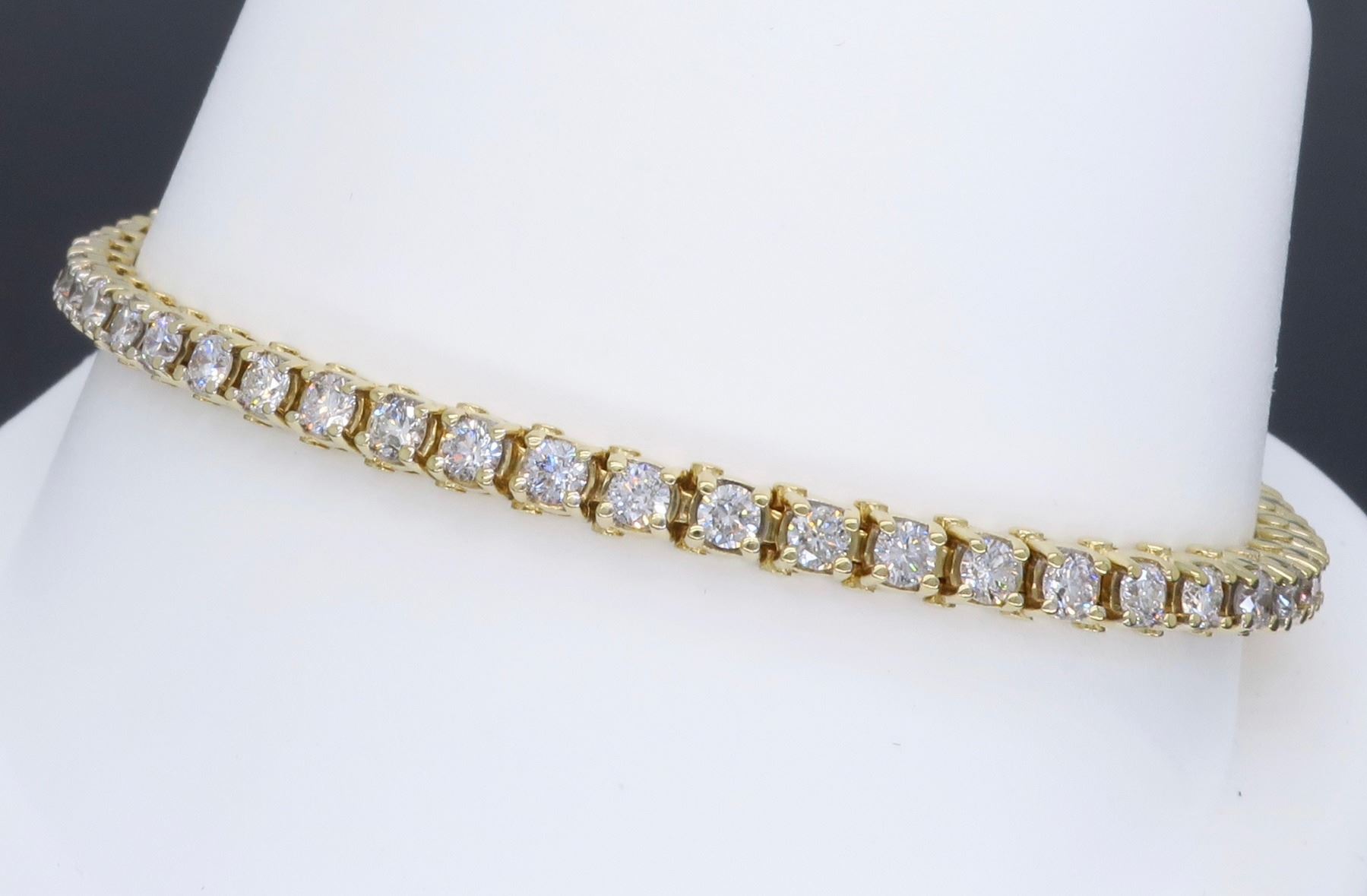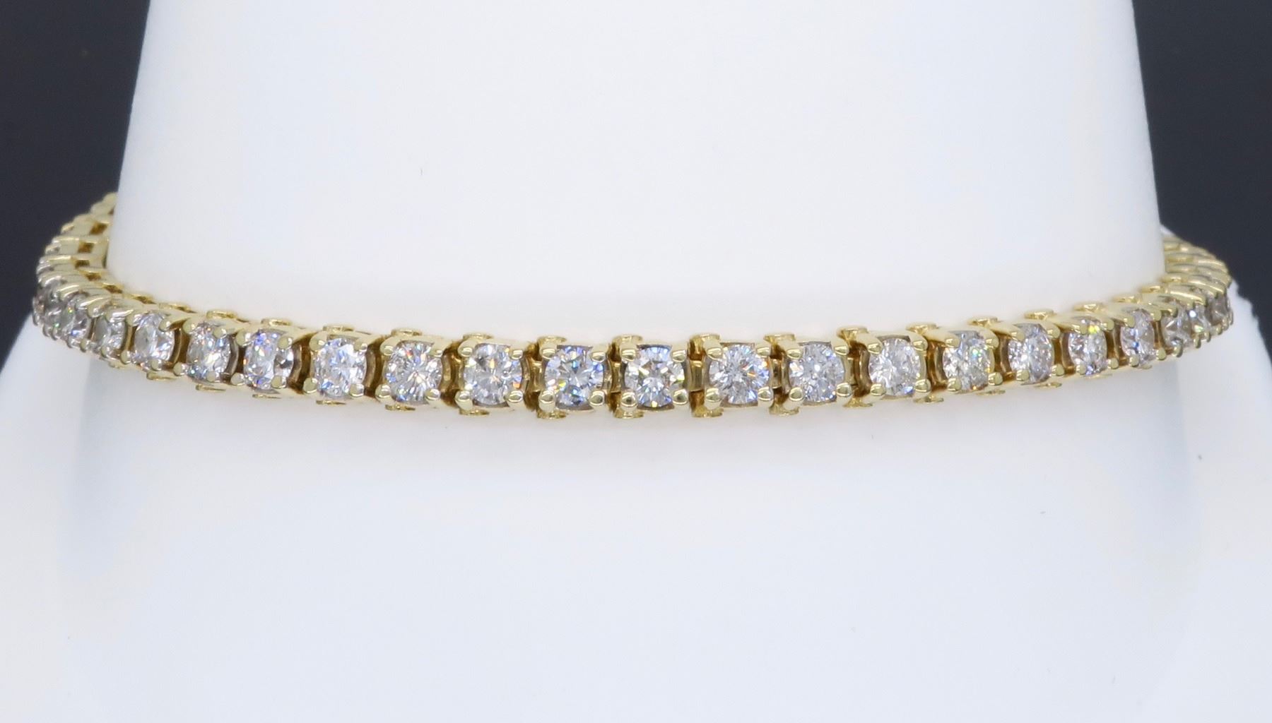 One 14KT Yellow Gold 3.50ctw Diamond Tennis Bracelet. Round Diamonds with a total weight of 3.50ctw with a color of H-K and clarity of SI-2 to I-2. Length of this bracelet is 7 inches. Total weight of this bracelet is 14.2 grams.