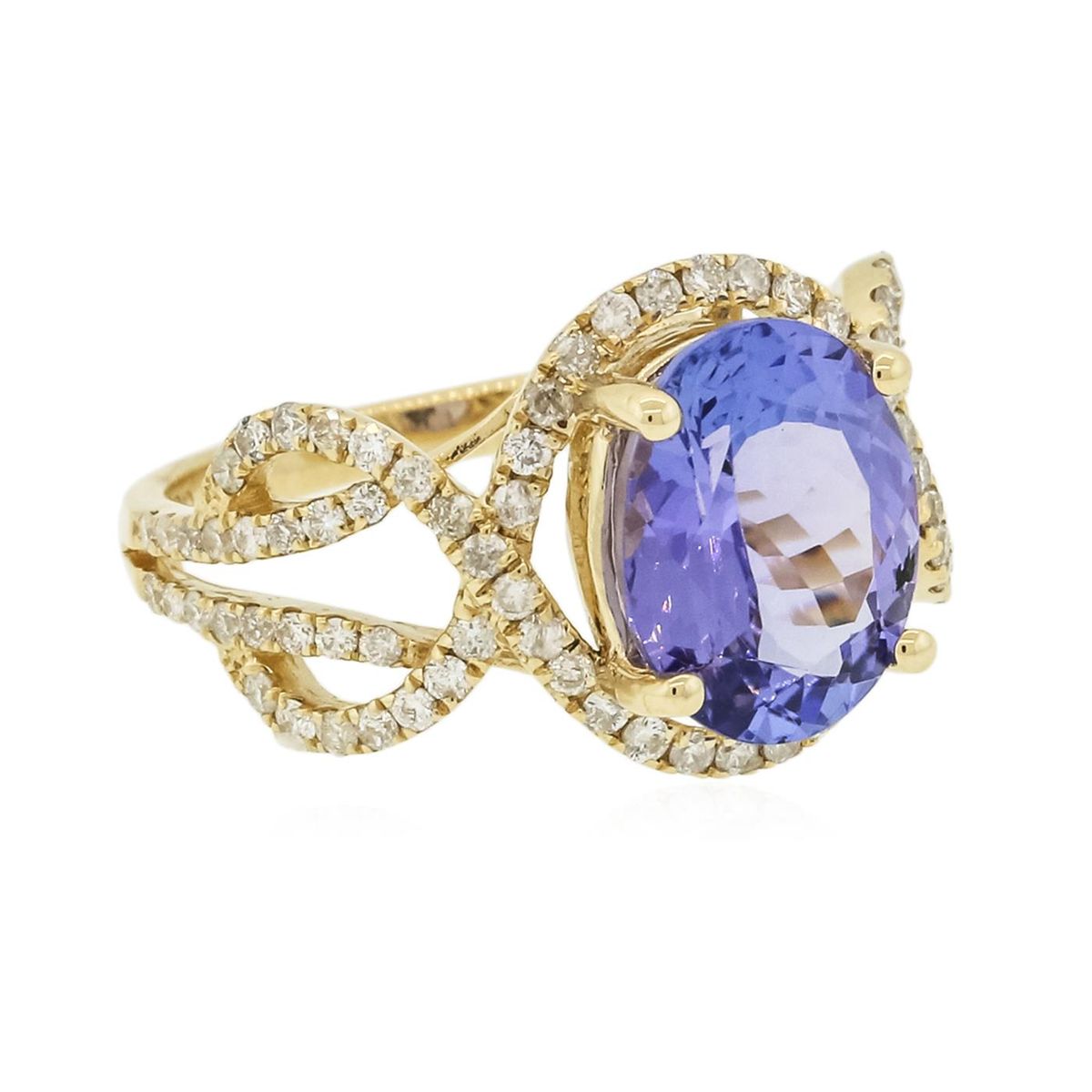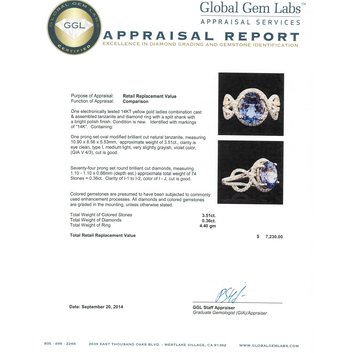 One electronically tested 14KT yellow gold ladies combination cast & assembled tanzanite and diamond ring with a split shank with a bright polish finish. Identified with markings of "14K". Condition is new. Containing: One prong set oval modified brilliant cut natural tanzanite, measuring 10.90 x 8.56 x 5.53mm, approximate weight of 3.51ct., clarity is eye clean, type I, medium light, very slightly grayish, violet color, (GIA V 4/3), cut is good. Seventy-Four prong set round brilliant cut diamonds, measuring 1.10 - 1.10 x 0.66mm (depth est.) approximate total weight of 74 Stones = 0.36ct. Clarity: I-1 to I-2. Color: I - J, Cut is Good. Colored gemstones are presumed to have been subjected to commonly used enhancement processes. All diamonds and colored gemstones are graded in the mounting, unless otherwise stated. Total Weight of Colored Stones 3.51ct. Total Weight of Diamonds 0.36ct. Total Weight of Ring 4.40 grams. GGL Appraised at $7,230.00.