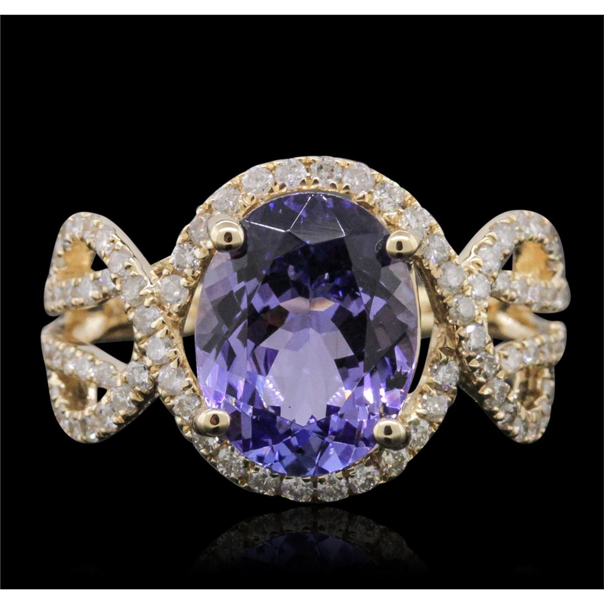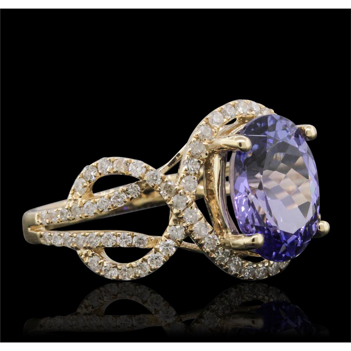 One electronically tested 14KT yellow gold ladies combination cast & assembled tanzanite and diamond ring with a split shank with a bright polish finish. Identified with markings of "14K". Condition is new. Containing: One prong set oval modified brilliant cut natural tanzanite, measuring 10.90 x 8.56 x 5.53mm, approximate weight of 3.51ct., clarity is eye clean, type I, medium light, very slightly grayish, violet color, (GIA V 4/3), cut is good. Seventy-Four prong set round brilliant cut diamonds, measuring 1.10 - 1.10 x 0.66mm (depth est.) approximate total weight of 74 Stones = 0.36ct. Clarity: I-1 to I-2. Color: I - J, Cut is Good. Colored gemstones are presumed to have been subjected to commonly used enhancement processes. All diamonds and colored gemstones are graded in the mounting, unless otherwise stated. Total Weight of Colored Stones 3.51ct. Total Weight of Diamonds 0.36ct. Total Weight of Ring 4.40 grams. GGL Appraised at $7,230.00.