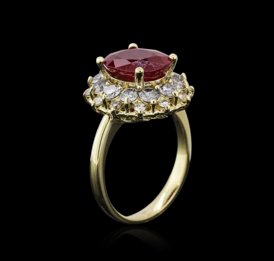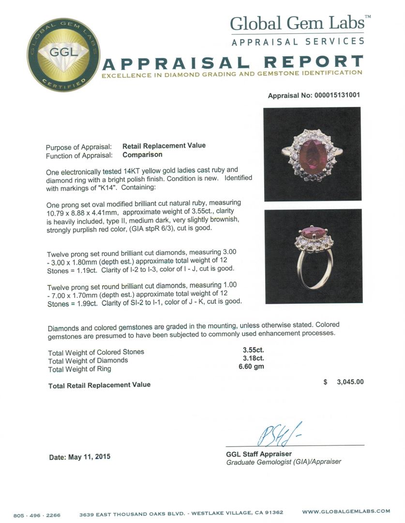 One electronically tested 14KT yellow gold ladies cast ruby and diamond ring with a bright polish finish. Identified with markings of "K14". Condition is new. Containing: One prong set oval modified brilliant cut natural ruby, measuring 10.79 x 8.88 x 4.41mm, approximate weight of 3.55ct., clarity is heavily included, type II, medium dark, very slightly brownish, strongly purplish red color, (GIA stpR 6/3), cut is good. Twelve prong set round brilliant cut diamonds, measuring 3.00 - 3.00 x 1.80mm (depth est.) approximate total weight of 12 Stones = 1.19ct. Clarity: I-2 to I-3. Color: I - J, Cut is Good. Twelve prong set round brilliant cut diamonds, measuring 1.00 - 7.00 x 1.70mm (depth est.) approximate total weight of 12 Stones = 1.99ct. Clarity: SI-2 to I-1. Color: J - K, Cut is Good. Diamonds and colored gemstones are graded in the mounting, unless otherwise stated. Colored gemstones are presumed to have been subjected to commonly used enhancement processes. Total Weight of Colored Stones 3.55ct. Total Weight of Diamonds 3.18ct. Total Weight of Ring 6.60 grams. GGL Appraised at $3,045.00.