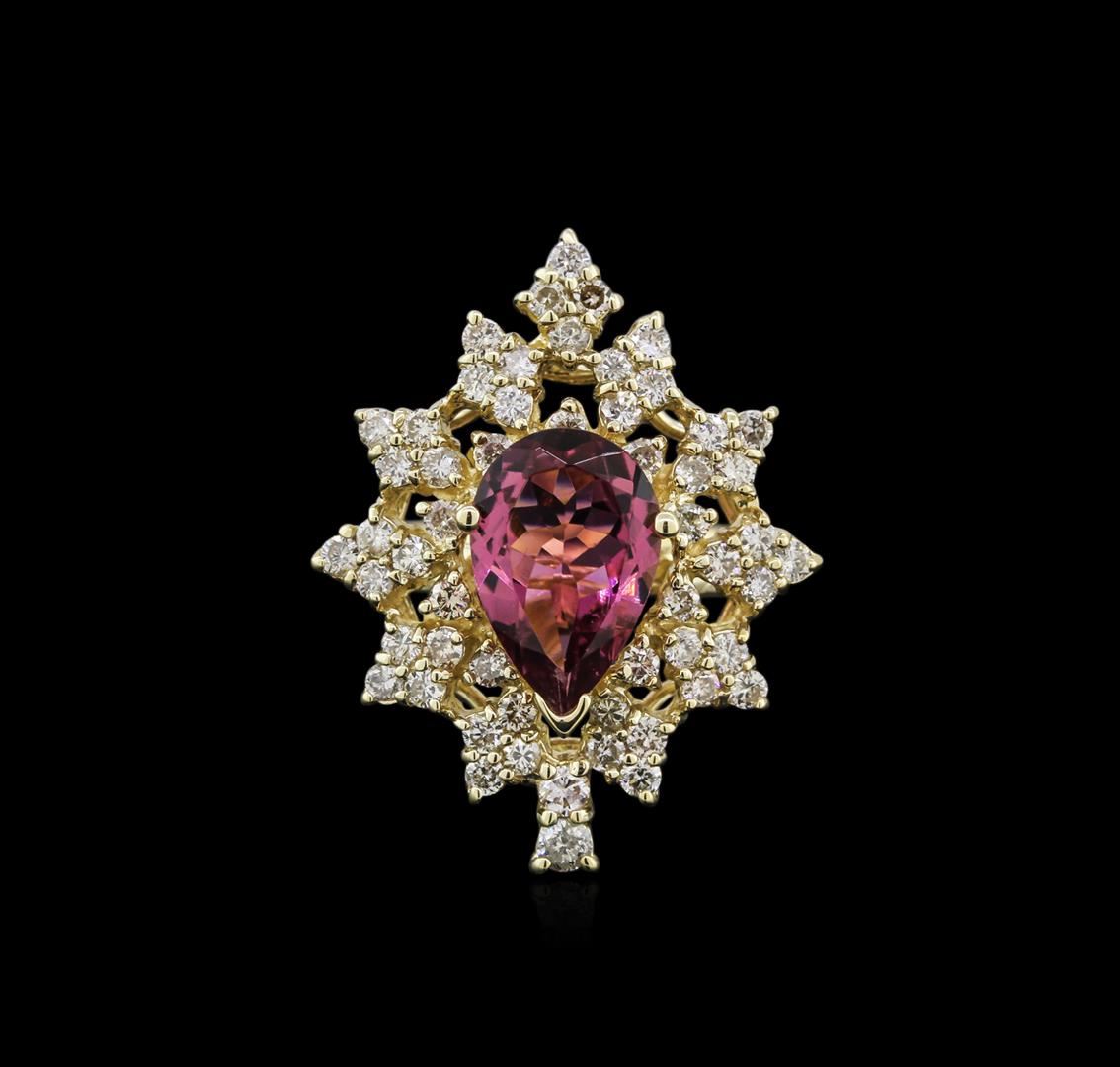 One electronically tested 14KT yellow gold ladies cast tourmaline and diamond ring with a cathedral shank with a bright polish finish. Identified with markings of "K14". Condition is new. Containing: One prong set pear modified brilliant cut natural pink tourmaline, measuring 11.25 x 8.93 x 5.80mm, approximate weight of 3.57ct., clarity is eye clean, type II, medium light, slightly grayish, reddish purple color, (GIA rP 4/2), cut is good. Fifty-Five prong set round brilliant cut diamonds, measuring 1.50 - 1.50 x 0.90mm (depth est.) approximate total weight of 55 Stones = 0.68ct. Clarity: SI-1 to SI-2. Color: K - L, Cut is Good. Colored gemstones are presumed to have been subjected to commonly used enhancement processes. Diamonds and colored gemstones are graded in the mounting, unless otherwise stated. Total Weight of Colored Stones 3.57ct. Total Weight of Diamonds 0.68ct. Total Weight of Ring 7.19 grams. GGL Appraised at $3,140.00.