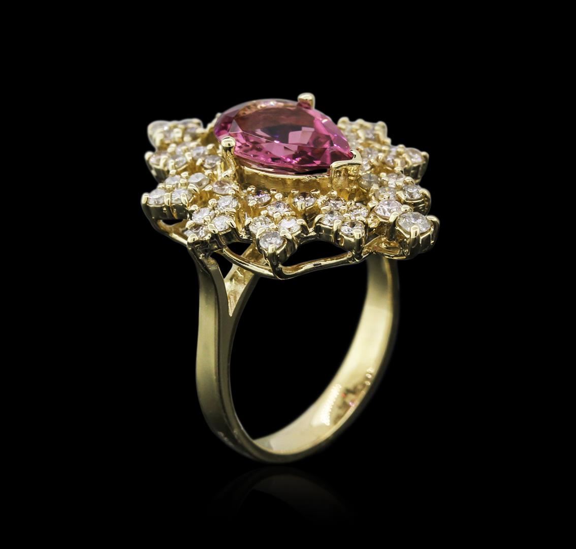 One electronically tested 14KT yellow gold ladies cast tourmaline and diamond ring with a cathedral shank with a bright polish finish. Identified with markings of "K14". Condition is new. Containing: One prong set pear modified brilliant cut natural pink tourmaline, measuring 11.25 x 8.93 x 5.80mm, approximate weight of 3.57ct., clarity is eye clean, type II, medium light, slightly grayish, reddish purple color, (GIA rP 4/2), cut is good. Fifty-Five prong set round brilliant cut diamonds, measuring 1.50 - 1.50 x 0.90mm (depth est.) approximate total weight of 55 Stones = 0.68ct. Clarity: SI-1 to SI-2. Color: K - L, Cut is Good. Colored gemstones are presumed to have been subjected to commonly used enhancement processes. Diamonds and colored gemstones are graded in the mounting, unless otherwise stated. Total Weight of Colored Stones 3.57ct. Total Weight of Diamonds 0.68ct. Total Weight of Ring 7.19 grams. GGL Appraised at $3,140.00.