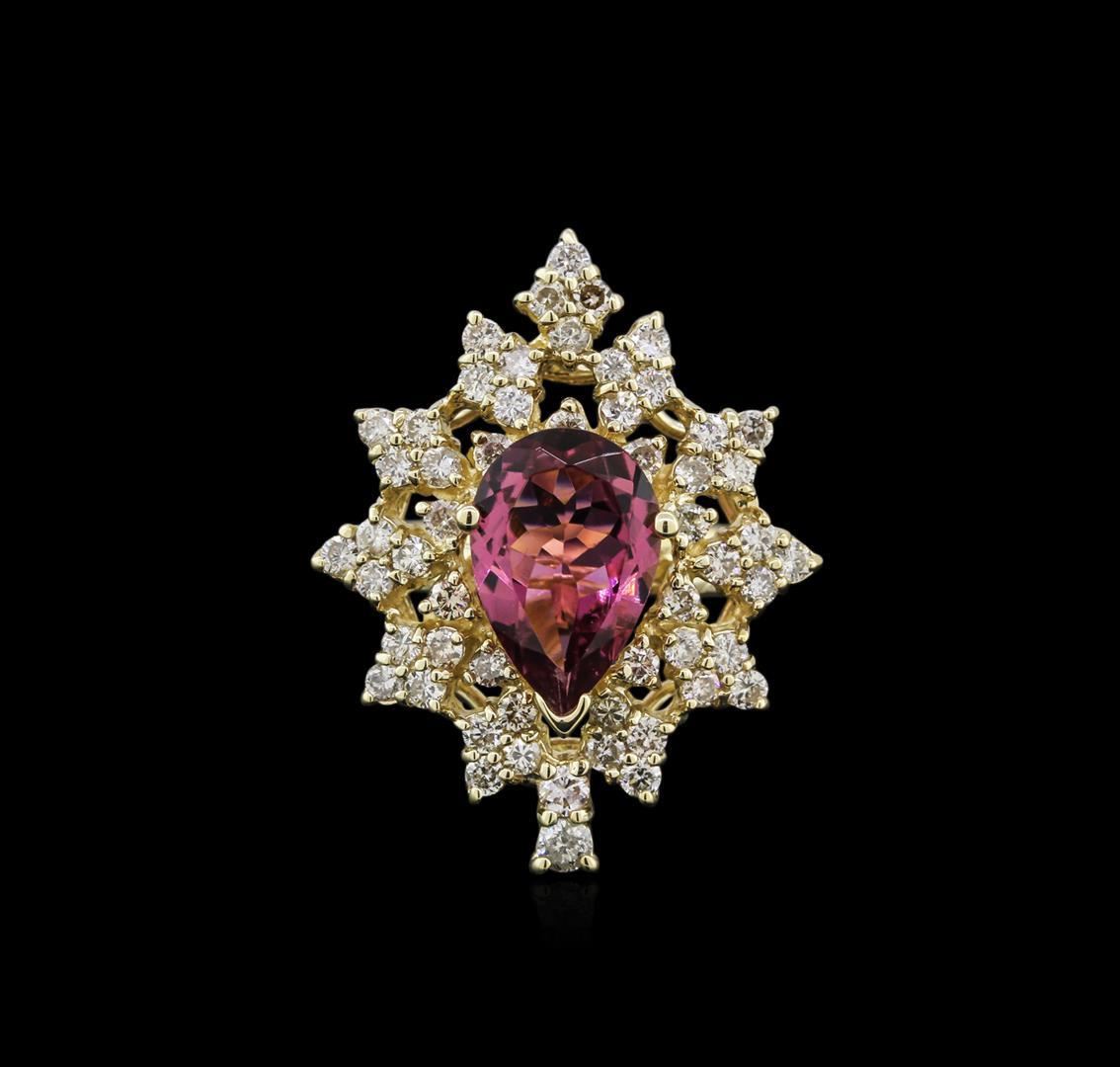 One electronically tested 14KT yellow gold ladies cast tourmaline and diamond ring with a cathedral shank with a bright polish finish. Identified with markings of "K14". Condition is new. Containing: One prong set pear modified brilliant cut natural pink tourmaline, measuring 11.25 x 8.93 x 5.80mm, approximate weight of 3.57ct., clarity is eye clean, type II, medium light, slightly grayish, reddish purple color, (GIA rP 4/2), cut is good. Fifty-Five prong set round brilliant cut diamonds, measuring 1.50 - 1.50 x 0.90mm (depth est.) approximate total weight of 55 Stones = 0.68ct. Clarity: SI-1 to SI-2. Color: K - L, Cut is Good. Colored gemstones are presumed to have been subjected to commonly used enhancement processes. Diamonds and colored gemstones are graded in the mounting, unless otherwise stated. Total Weight of Colored Stones 3.57ct. Total Weight of Diamonds 0.68ct. Total Weight of Ring 7.19 grams. GGL Appraised.