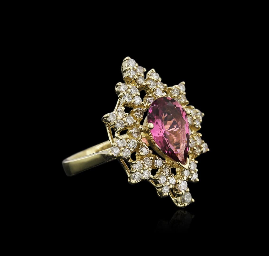 One electronically tested 14KT yellow gold ladies cast tourmaline and diamond ring with a cathedral shank with a bright polish finish. Identified with markings of "K14". Condition is new. Containing: One prong set pear modified brilliant cut natural pink tourmaline, measuring 11.25 x 8.93 x 5.80mm, approximate weight of 3.57ct., clarity is eye clean, type II, medium light, slightly grayish, reddish purple color, (GIA rP 4/2), cut is good. Fifty-Five prong set round brilliant cut diamonds, measuring 1.50 - 1.50 x 0.90mm (depth est.) approximate total weight of 55 Stones = 0.68ct. Clarity: SI-1 to SI-2. Color: K - L, Cut is Good. Colored gemstones are presumed to have been subjected to commonly used enhancement processes. Diamonds and colored gemstones are graded in the mounting, unless otherwise stated. Total Weight of Colored Stones 3.57ct. Total Weight of Diamonds 0.68ct. Total Weight of Ring 7.19 grams. GGL Appraised.