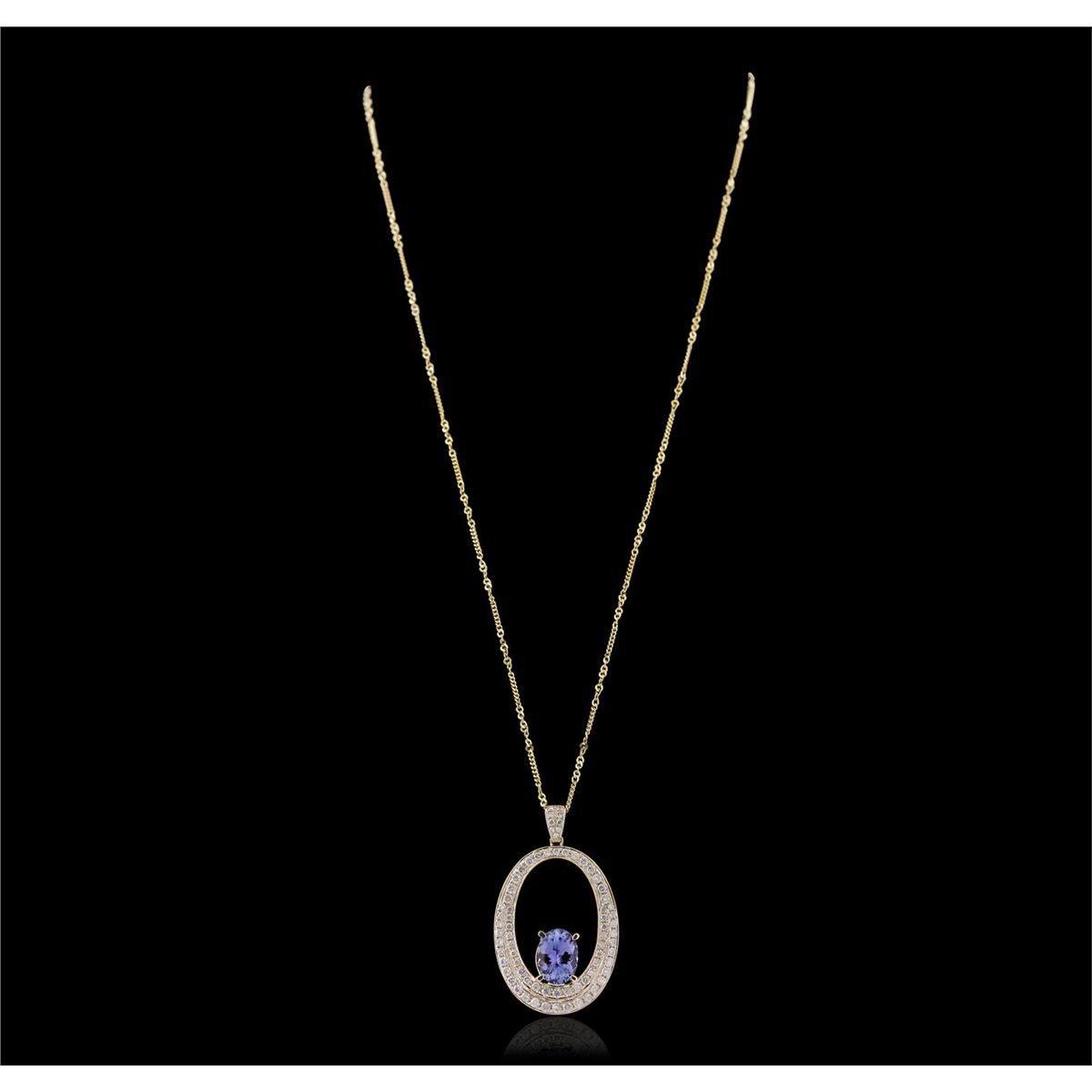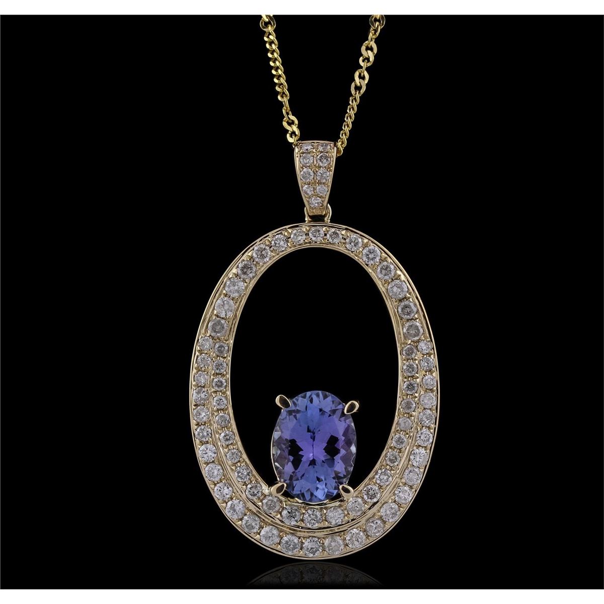 One electronically tested 14KT yellow gold ladies cast & assembled tanzanite and diamond pendant with chain. The pendant features a tanzanite set within a stylized diamond frame, completed by a diamond set bail. The pendant is supported by an eighteen inch length 14KT yellow gold designer style chain, terminating in a spring ring clasp. Bright polish finish. Trademark is Orianne. Identified with markings of "14K". Condition is new, good workmanship. Containing: One prong set oval brilliant cut natural tanzanite, measuring 11.00 x 8.20 x 5.50mm, 6% bulge factor, approximate weight of 3.60ct., clarity is eye clean, type I, medium dark, very slightly grayish, bluish violet color, (GIA bV 6/3), cut is good. Transmitting light with no distortion, transparent. Graded in the setting. Tanzanite is a very rare gemstone that is only found in the country of Tanzania. Originally discovered in 1967. Tiffany & Company, named the stone Tanzanite. It is found in the Usumburu Mountains that border the Umba Valley of northern Tanzania. Tanzanite occurs in gray, brown, violet, blue, reddish-purple, & green. The gem is interesting because of its exceptional pleochroism. Rotated in different directions a tanzanite will exhibit multiple changes of color. Tanzanite has a low tolerance to ultrasonic cleaning, and should not be cleaned using this method. Seventy-Four prong set round brilliant cut diamonds approximate total weight of 74 Stones = 3.38ct. Graded in the setting. Clarity: SI-2 to I-1. Color: G - I. Total Weight of Colored Stones 3.60ct. Total Weight of Diamonds 3.38ct. Total Weight of Pendant With Chain 9.00 grams. AIG Appraised at $20,305.00.