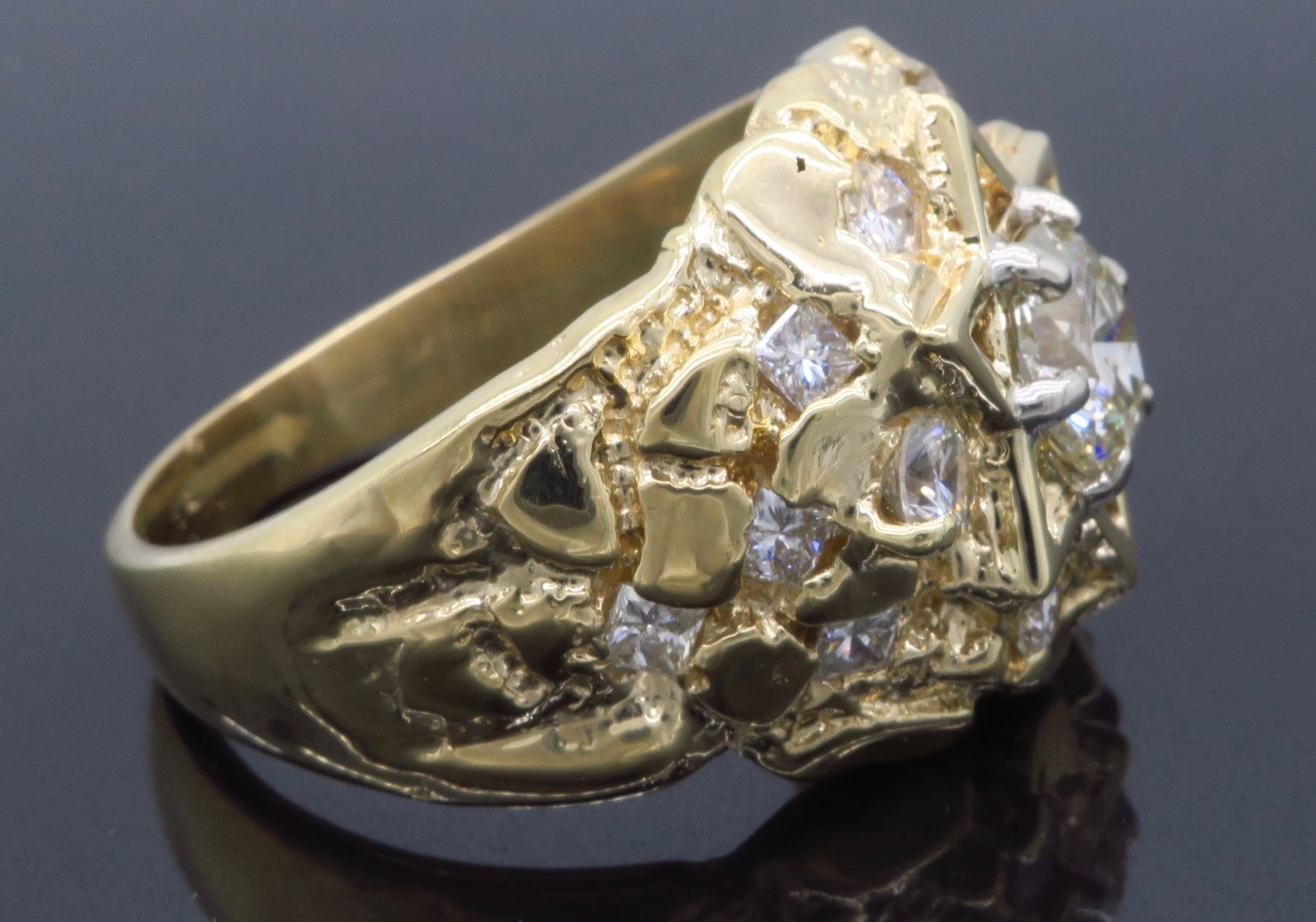 One 14KT Yellow Gold 3.62ctw Diamond Ring. (1) Round center Diamond with a total weight of 1.82cts with a color of J-K and clarity of SI-2. Side round diamonds with a total weight of 1.80cts. Total weight of this ring is 29 grams. Ring size is 14.5.