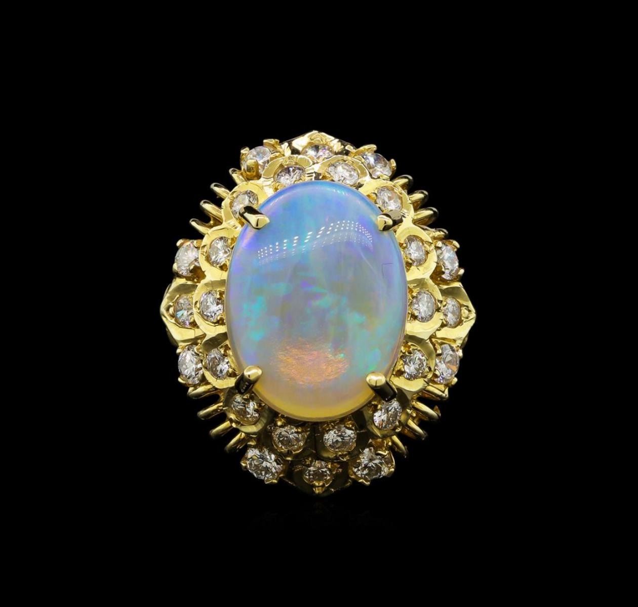 One electronically tested 14KT yellow gold ladies cast opal and diamond ring with a bright polish finish. Identified with markings of "14K". Condition is new. Containing: One white opal that is cut in a oval shape and is prong set, measuring 16.00 mm long x 11.00 mm wide, and 4.70 mm thick and the approximate weight is 3.68 carats. The opal has a somewhat bright, blue-green play of color (fire) in a flashfire pattern; a medium dome; a good cut; no inclusions; consistent in its brightness and pattern; and is somewhat directional. Twenty-Seven prong set round brilliant cut diamonds, measuring 2.80 - 2.00 x 1.44mm (depth est.) approximate total weight of 27 Stones = 1.37ct. Clarity: SI-1 to SI-2. Color: I - J, Cut is Good. Colored gemstones are presumed to have been subjected to commonly used enhancement processes. All diamonds and colored gemstones are graded in the mounting, unless otherwise stated. Total Weight of Diamonds 1.37ct. Total Weight of Opals 3.68ct. Total Weight of Ring 11.40 grams. GGL Appraised.