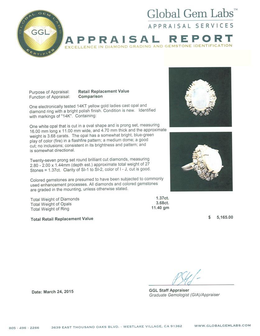One electronically tested 14KT yellow gold ladies cast opal and diamond ring with a bright polish finish. Identified with markings of "14K". Condition is new. Containing: One white opal that is cut in a oval shape and is prong set, measuring 16.00 mm long x 11.00 mm wide, and 4.70 mm thick and the approximate weight is 3.68 carats. The opal has a somewhat bright, blue-green play of color (fire) in a flashfire pattern; a medium dome; a good cut; no inclusions; consistent in its brightness and pattern; and is somewhat directional. Twenty-Seven prong set round brilliant cut diamonds, measuring 2.80 - 2.00 x 1.44mm (depth est.) approximate total weight of 27 Stones = 1.37ct. Clarity: SI-1 to SI-2. Color: I - J, Cut is Good. Colored gemstones are presumed to have been subjected to commonly used enhancement processes. All diamonds and colored gemstones are graded in the mounting, unless otherwise stated. Total Weight of Diamonds 1.37ct. Total Weight of Opals 3.68ct. Total Weight of Ring 11.40 grams. GGL Appraised.