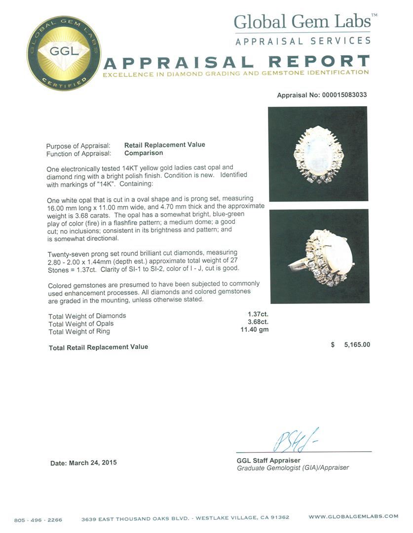 One electronically tested 14KT yellow gold ladies cast opal and diamond ring with a bright polish finish. Identified with markings of "14K". Condition is new. Containing: One white opal that is cut in a oval shape and is prong set, measuring 16.00 mm long x 11.00 mm wide, and 4.70 mm thick and the approximate weight is 3.68 carats. The opal has a somewhat bright, blue-green play of color (fire) in a flashfire pattern; a medium dome; a good cut; no inclusions; consistent in its brightness and pattern; and is somewhat directional. Twenty-Seven prong set round brilliant cut diamonds, measuring 2.80 - 2.00 x 1.44mm (depth est.) approximate total weight of 27 Stones = 1.37ct. Clarity: SI-1 to SI-2. Color: I - J, Cut is Good. Colored gemstones are presumed to have been subjected to commonly used enhancement processes. All diamonds and colored gemstones are graded in the mounting, unless otherwise stated. Total Weight of Diamonds 1.37ct. Total Weight of Opals 3.68ct. Total Weight of Ring 11.40 grams. GGL Appraised at $5,165.00.