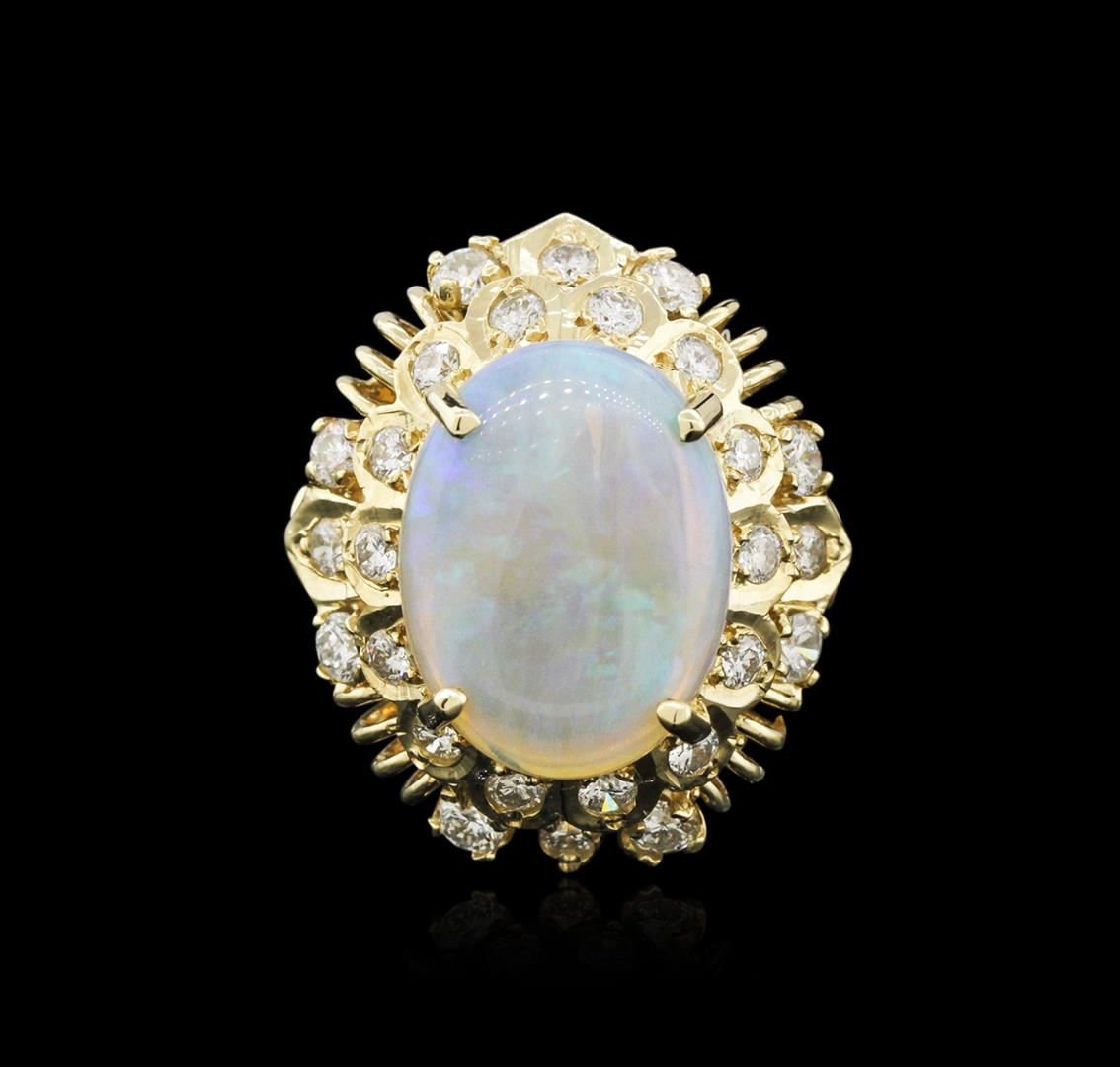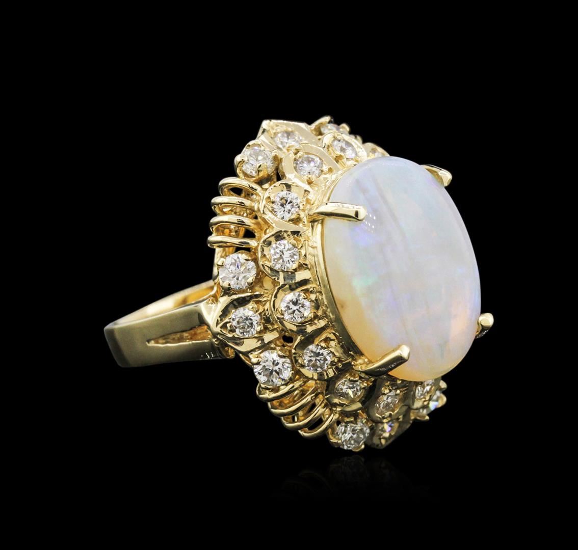 One electronically tested 14KT yellow gold ladies cast opal and diamond ring with a bright polish finish. Identified with markings of "14K". Condition is new. Containing: One white opal that is cut in a oval shape and is prong set, measuring 16.00 mm long x 11.00 mm wide, and 4.70 mm thick and the approximate weight is 3.68 carats. The opal has a somewhat bright, blue-green play of color (fire) in a flashfire pattern; a medium dome; a good cut; no inclusions; consistent in its brightness and pattern; and is somewhat directional. Twenty-Seven prong set round brilliant cut diamonds, measuring 2.80 - 2.00 x 1.44mm (depth est.) approximate total weight of 27 Stones = 1.37ct. Clarity: SI-1 to SI-2. Color: I - J, Cut is Good. Colored gemstones are presumed to have been subjected to commonly used enhancement processes. All diamonds and colored gemstones are graded in the mounting, unless otherwise stated. Total Weight of Diamonds 1.37ct. Total Weight of Opals 3.68ct. Total Weight of Ring 11.40 grams. GGL Appraised at $5,165.00.