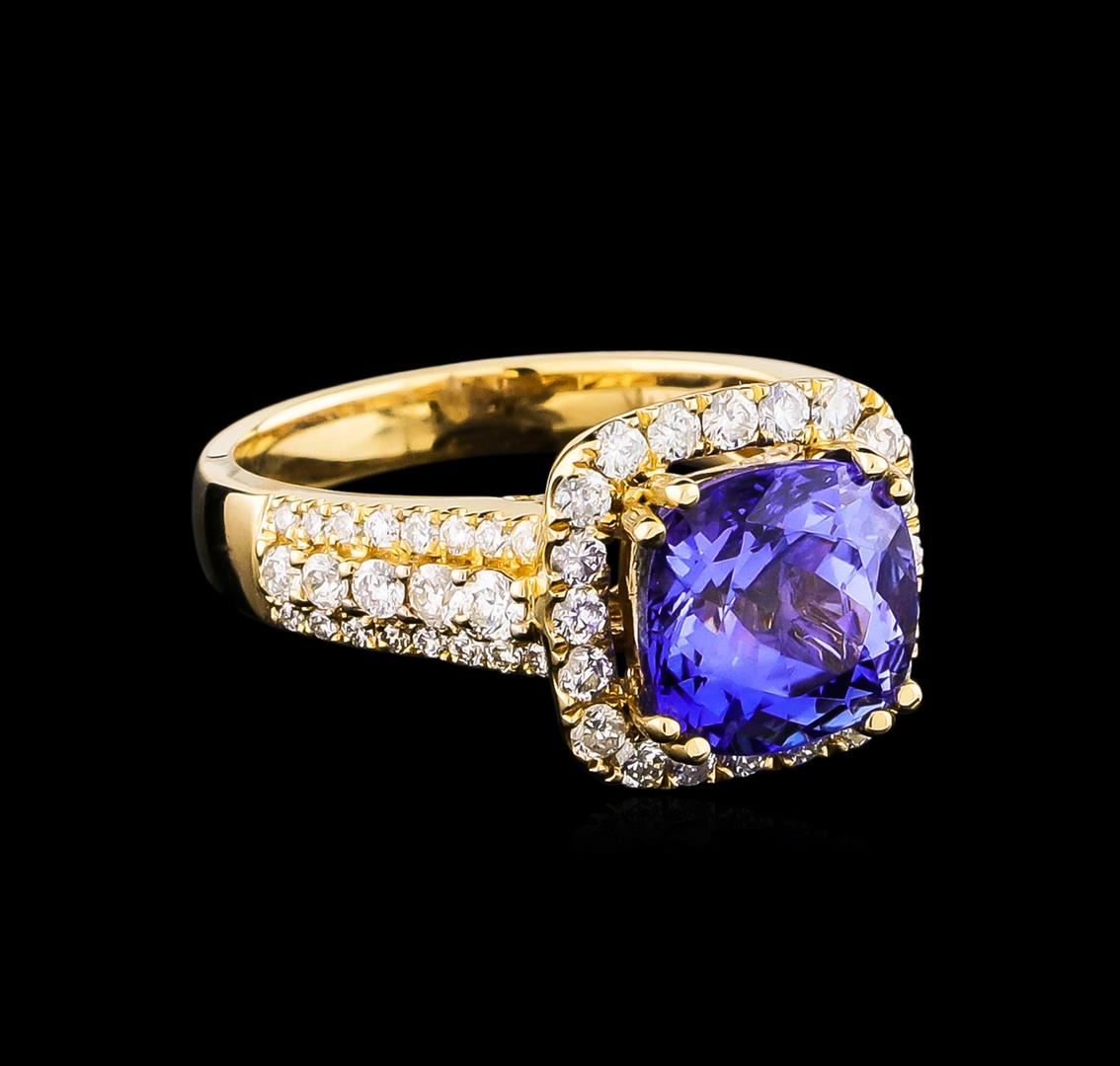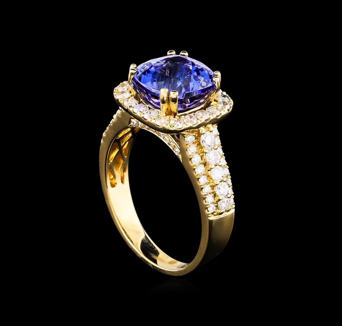 One electronically tested 14KT yellow gold Ladies combination cast & assembled ring with a bright polish finish. Condition is new. Identified with markings of "14K". Containing: One prong set square modified brilliant cut natural tanzanite, measuring 8.80 x 8.80 x 5.72mm, approximate weight of 3.71ct., clarity is eye clean, type I, medium, moderately strong, violet color, (GIA V 5/4), cut is good. Eighty prong set round brilliant cut diamonds, measuring 1.80 - 1.30 x 0.93mm (depth est.) approximate total weight of 80 Stones = 1.09ct. Clarity: SI-2 to I-1. Color: I - J, Cut is Good. Colored gemstones are presumed to have been subjected to commonly used enhancement processes. All diamonds and colored gemstones are graded in the mounting, unless otherwise stated. Total Weight of Colored Stones 3.71ct. Total Weight of Diamonds 1.09ct. Total Weight of Ring 6.10 grams. GGL Appraised at $9,100.00.