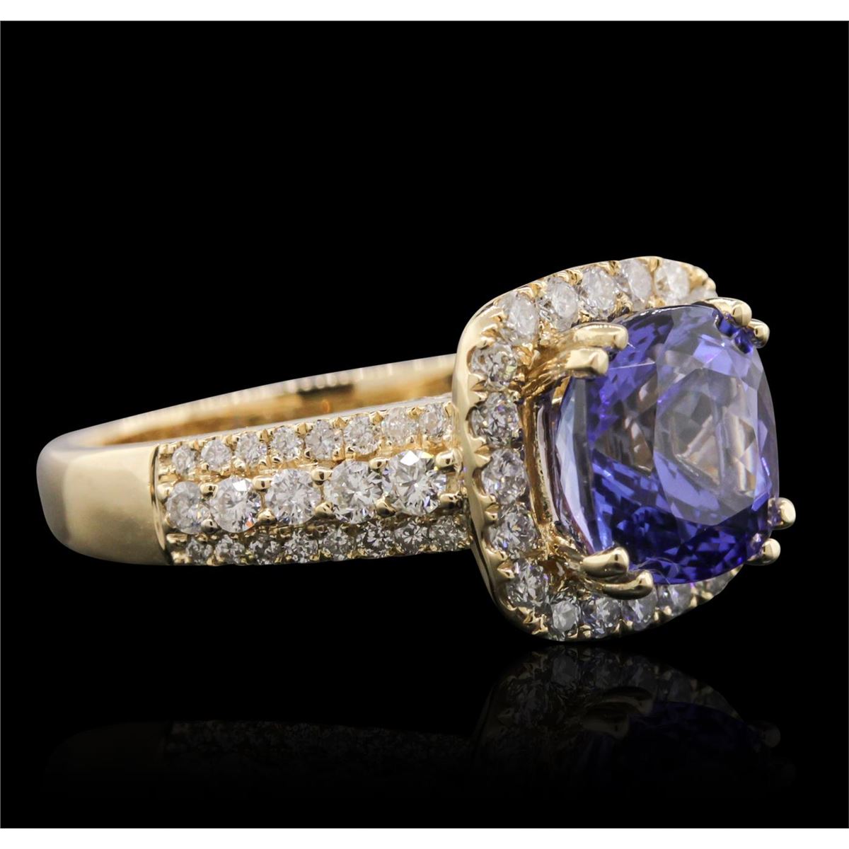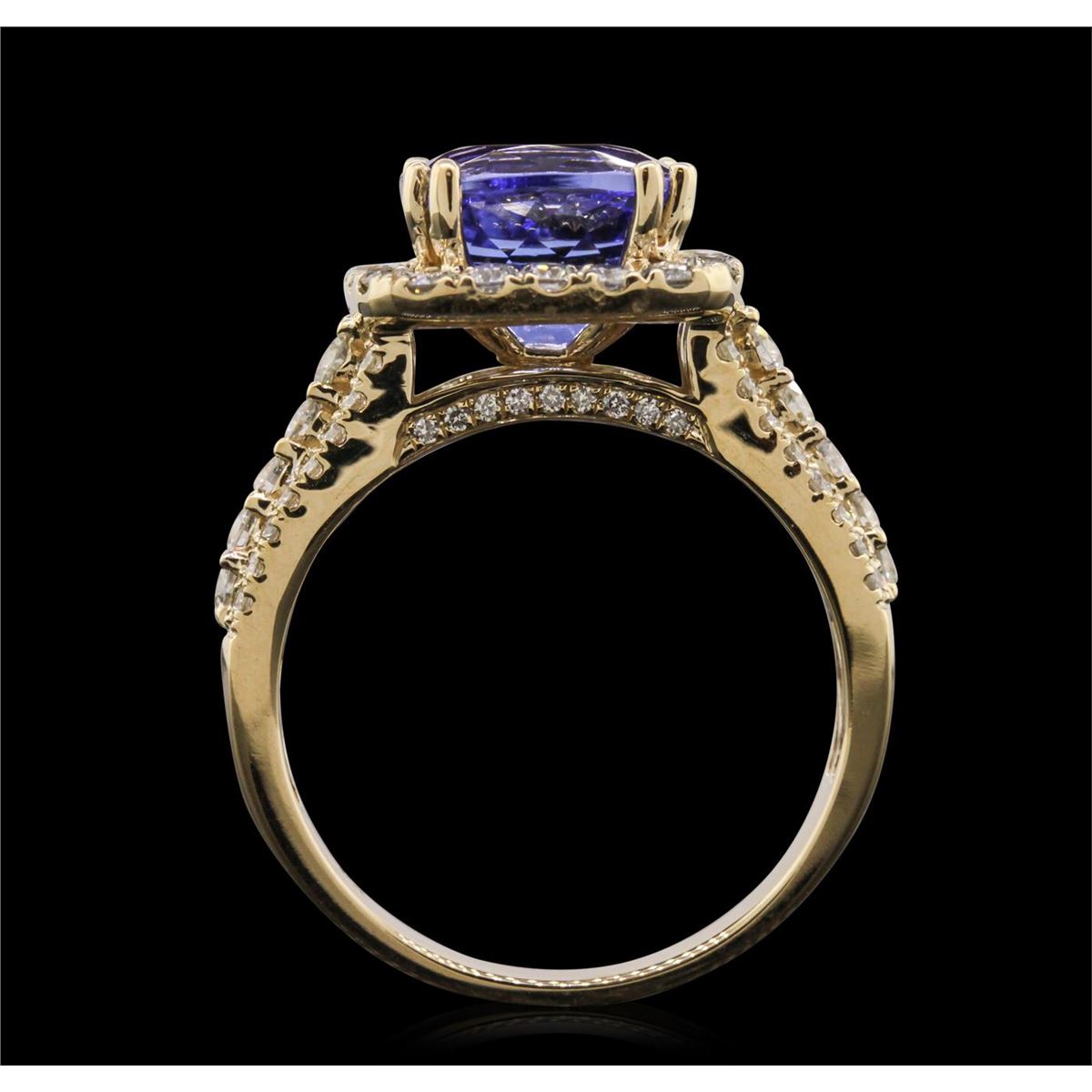 One electronically tested 14KT yellow gold Ladies combination cast & assembled ring with a bright polish finish. Condition is new. Identified with markings of "14K". Containing: One prong set square modified brilliant cut natural tanzanite, measuring 8.80 x 8.80 x 5.72mm, approximate weight of 3.71ct., clarity is eye clean, type I, medium, moderately strong, violet color, (GIA V 5/4), cut is good. Eighty prong set round brilliant cut diamonds, measuring 1.80 - 1.30 x 0.93mm (depth est.) approximate total weight of 80 Stones = 1.09ct. Clarity: SI-2 to I-1. Color: I - J, Cut is Good. Colored gemstones are presumed to have been subjected to commonly used enhancement processes. All diamonds and colored gemstones are graded in the mounting, unless otherwise stated. Total Weight of Colored Stones 3.71ct. Total Weight of Diamonds 1.09ct. Total Weight of Ring 6.10 grams. GGL Appraised at $9,100.00.