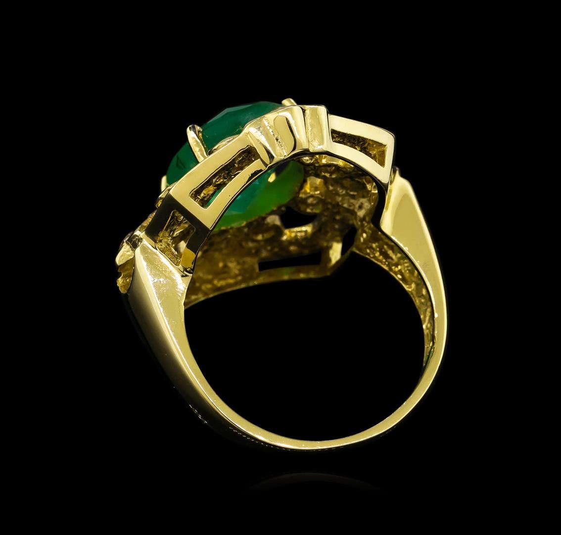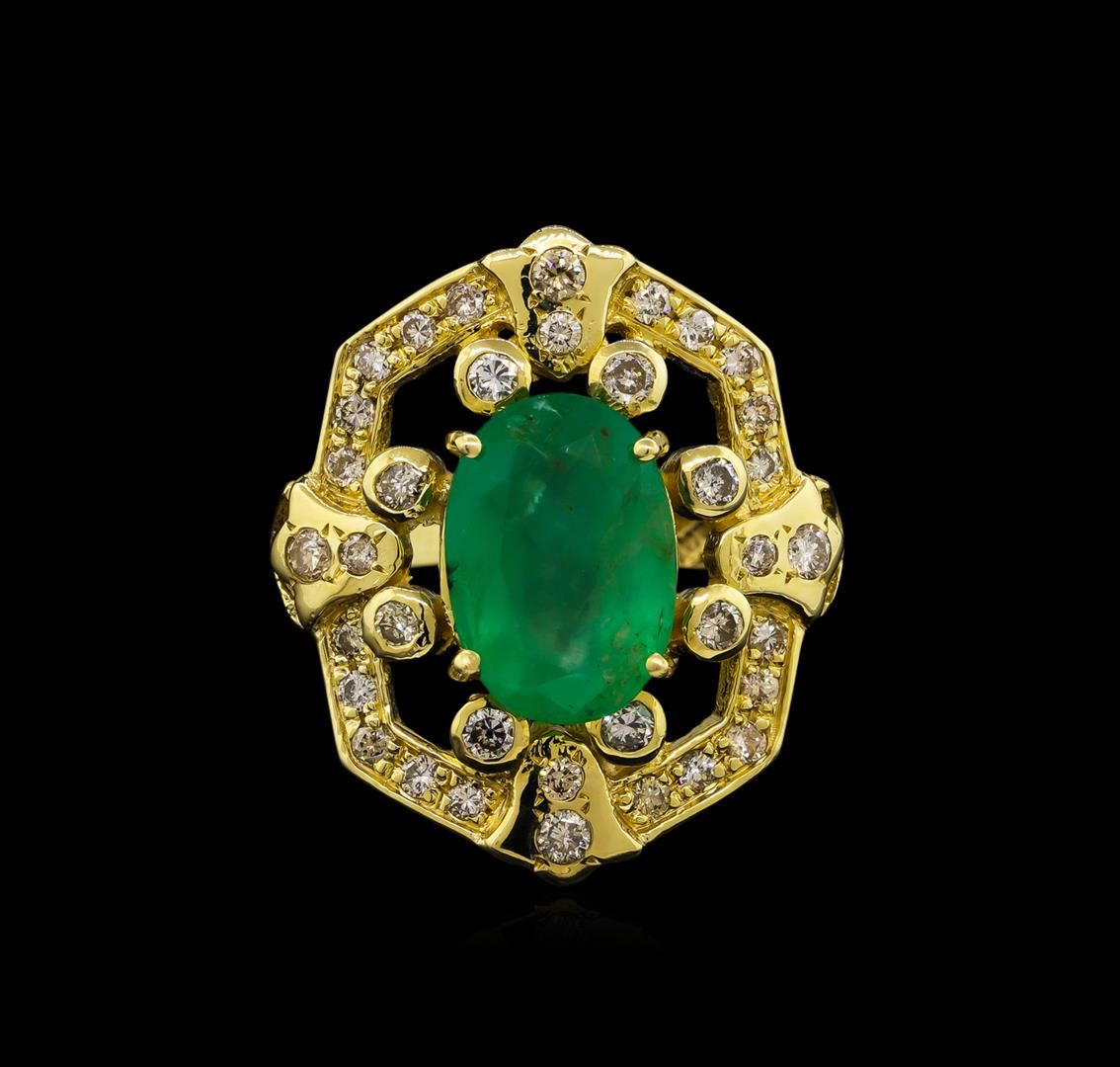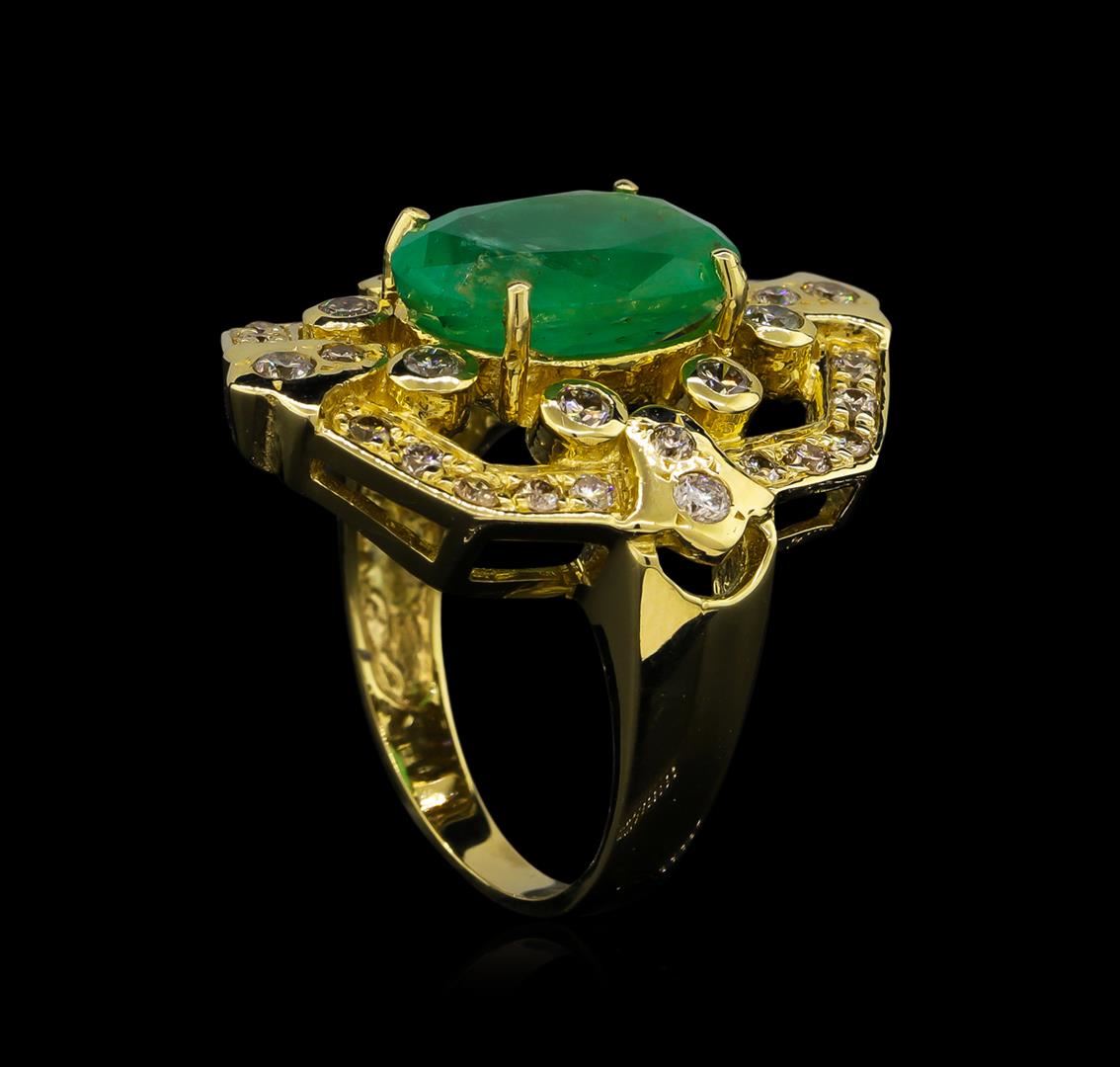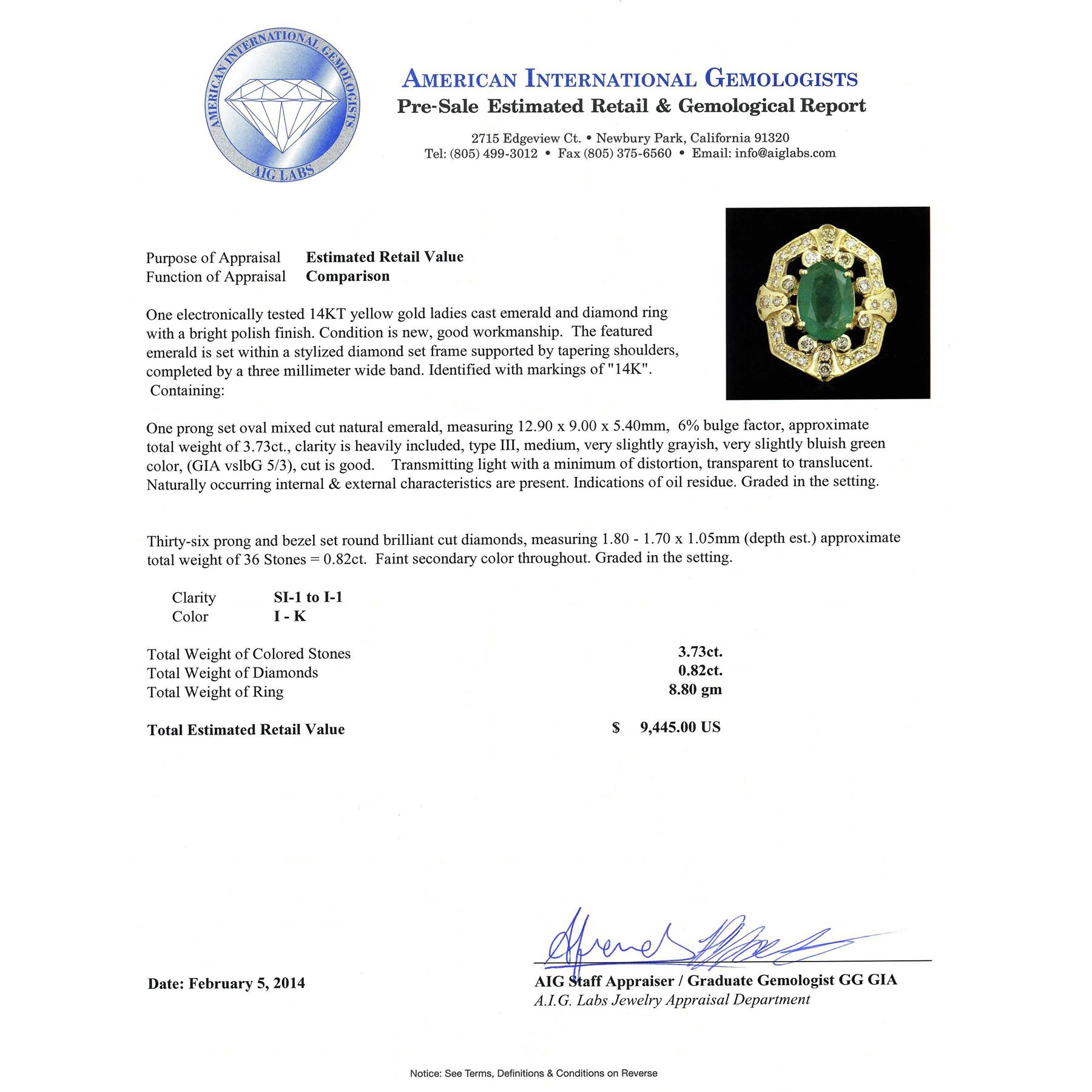 One electronically tested 14KT Yellow Gold ladies cast emerald and diamond ring with a bright polish finish. Condition is new, good workmanship. The featured emerald is set within a stylized diamond set frame supported by tapering shoulders, completed by a three millimeter wide band. Identified with markings of "14K". Containing: One prong set oval mixed cut natural emerald, measuring 12.90 x 9.00 x 5.40mm, 6%. bulge factor, approximate total weight of 3.73ct., clarity is heavily included, type III, medium, very slightly grayish, very slightly bluish green color, (GIA vslbG 5/3), cut is Good. Transmitting light with a minimum of distortion, transparent to translucent. Naturally occurring internal & external characteristics are present. Indications of oil residue. Graded in the setting. Thirty-Six prong and bezel set round brilliant cut diamonds, measuring 1.80 - 1.70 x 1.05mm (depth est.) approximate total weight of 36 Stones = 0.82ct. Faint secondary color throughout. Graded in the setting. Clarity: SI-1 to I-1. Color: I - K. Total Weight of Colored Stones 3.73ct. Total Weight of Diamonds 0.82ct. Total Weight of Ring 8.80 grams. AIG Appraised.