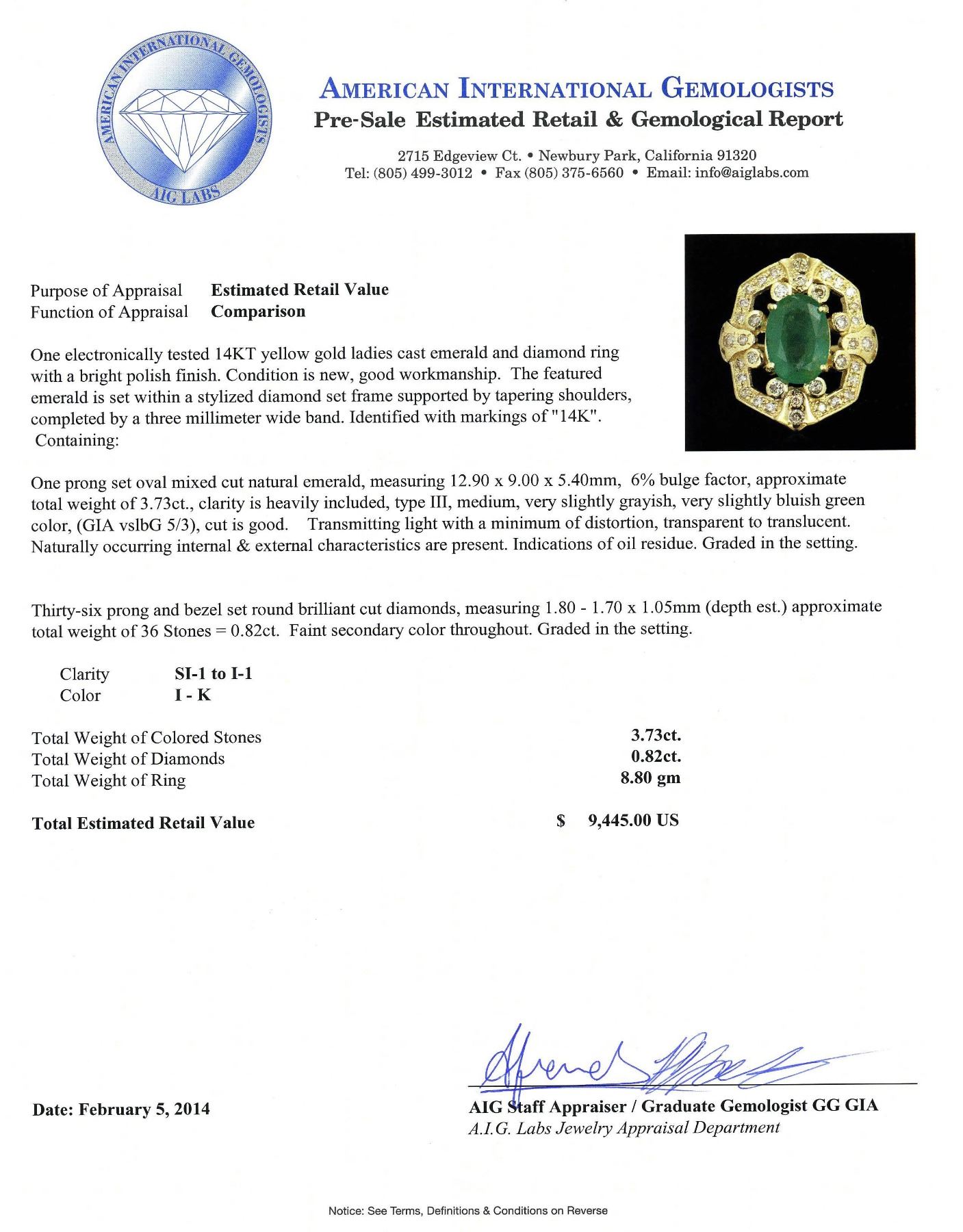 One electronically tested 14KT Yellow Gold ladies cast emerald and diamond ring with a bright polish finish. Condition is new, good workmanship. The featured emerald is set within a stylized diamond set frame supported by tapering shoulders, completed by a three millimeter wide band. Identified with markings of "14K". Containing: One prong set oval mixed cut natural emerald, measuring 12.90 x 9.00 x 5.40mm, 6%. bulge factor, approximate total weight of 3.73ct., clarity is heavily included, type III, medium, very slightly grayish, very slightly bluish green color, (GIA vslbG 5/3), cut is Good. Transmitting light with a minimum of distortion, transparent to translucent. Naturally occurring internal & external characteristics are present. Indications of oil residue. Graded in the setting. Thirty-Six prong and bezel set round brilliant cut diamonds, measuring 1.80 - 1.70 x 1.05mm (depth est.) approximate total weight of 36 Stones = 0.82ct. Faint secondary color throughout. Graded in the setting. Clarity: SI-1 to I-1. Color: I - K. Total Weight of Colored Stones 3.73ct. Total Weight of Diamonds 0.82ct. Total Weight of Ring 8.80 grams. AIG Appraised.