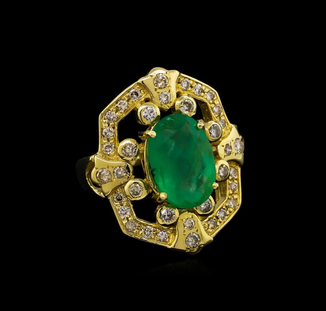 One electronically tested 14KT Yellow Gold ladies cast emerald and diamond ring with a bright polish finish. Condition is new, good workmanship. The featured emerald is set within a stylized diamond set frame supported by tapering shoulders, completed by a three millimeter wide band. Identified with markings of "14K". Containing: One prong set oval mixed cut natural emerald, measuring 12.90 x 9.00 x 5.40mm, 6%. bulge factor, approximate total weight of 3.73ct., clarity is heavily included, type III, medium, very slightly grayish, very slightly bluish green color, (GIA vslbG 5/3), cut is Good. Transmitting light with a minimum of distortion, transparent to translucent. Naturally occurring internal & external characteristics are present. Indications of oil residue. Graded in the setting. Thirty-Six prong and bezel set round brilliant cut diamonds, measuring 1.80 - 1.70 x 1.05mm (depth est.) approximate total weight of 36 Stones = 0.82ct. Faint secondary color throughout. Graded in the setting. Clarity: SI-1 to I-1. Color: I - K. Total Weight of Colored Stones 3.73ct. Total Weight of Diamonds 0.82ct. Total Weight of Ring 8.80 grams. AIG Appraised.
