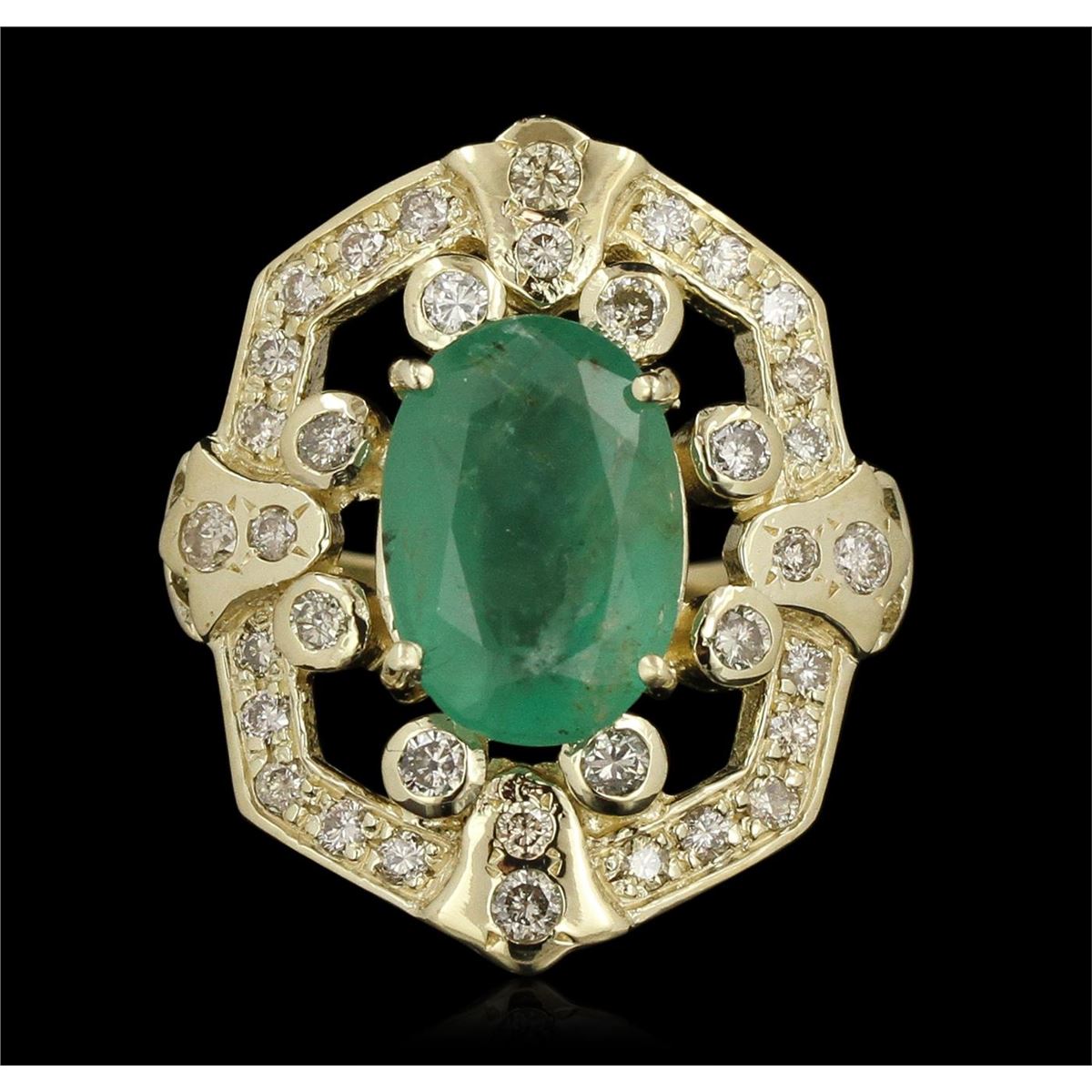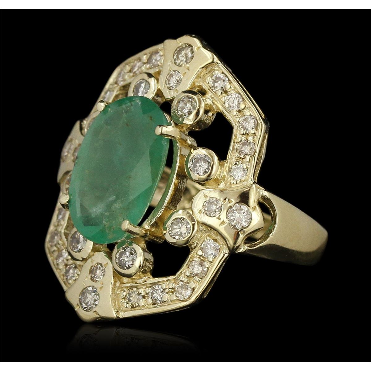 One electronically tested 14KT Yellow Gold ladies cast emerald and diamond ring with a bright polish finish. Condition is new, good workmanship. The featured emerald is set within a stylized diamond set frame supported by tapering shoulders, completed by a three millimeter wide band. Identified with markings of "14K". Containing: One prong set oval mixed cut natural emerald, measuring 12.90 x 9.00 x 5.40mm, 6%. bulge factor, approximate total weight of 3.73ct., clarity is heavily included, type III, medium, very slightly grayish, very slightly bluish green color, (GIA vslbG 5/3), cut is Good. Transmitting light with a minimum of distortion, transparent to translucent. Naturally occurring internal & external characteristics are present. Indications of oil residue. Graded in the setting. Thirty-Six prong and bezel set round brilliant cut diamonds, measuring 1.80 - 1.70 x 1.05mm (depth est.) approximate total weight of 36 Stones = 0.82ct. Faint secondary color throughout. Graded in the setting. Clarity: SI-1 to I-1. Color: I - K. Total Weight of Colored Stones 3.73ct. Total Weight of Diamonds 0.82ct. Total Weight of Ring 8.80 grams. AIG Appraised at $9,445.00.