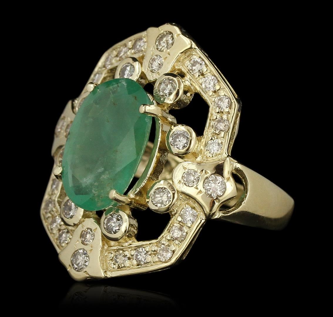 One electronically tested 14KT Yellow Gold ladies cast emerald and diamond ring with a bright polish finish. Condition is new, good workmanship. The featured emerald is set within a stylized diamond set frame supported by tapering shoulders, completed by a three millimeter wide band. Identified with markings of "14K". Containing: One prong set oval mixed cut natural emerald, measuring 12.90 x 9.00 x 5.40mm, 6%. bulge factor, approximate total weight of 3.73ct., clarity is heavily included, type III, medium, very slightly grayish, very slightly bluish green color, (GIA vslbG 5/3), cut is Good. Transmitting light with a minimum of distortion, transparent to translucent. Naturally occurring internal & external characteristics are present. Indications of oil residue. Graded in the setting. Thirty-Six prong and bezel set round brilliant cut diamonds, measuring 1.80 - 1.70 x 1.05mm (depth est.) approximate total weight of 36 Stones = 0.82ct. Faint secondary color throughout. Graded in the setting. Clarity: SI-1 to I-1. Color: I - K. Total Weight of Colored Stones 3.73ct. Total Weight of Diamonds 0.82ct. Total Weight of Ring 8.80 grams. AIG Appraised at $9,445.00.