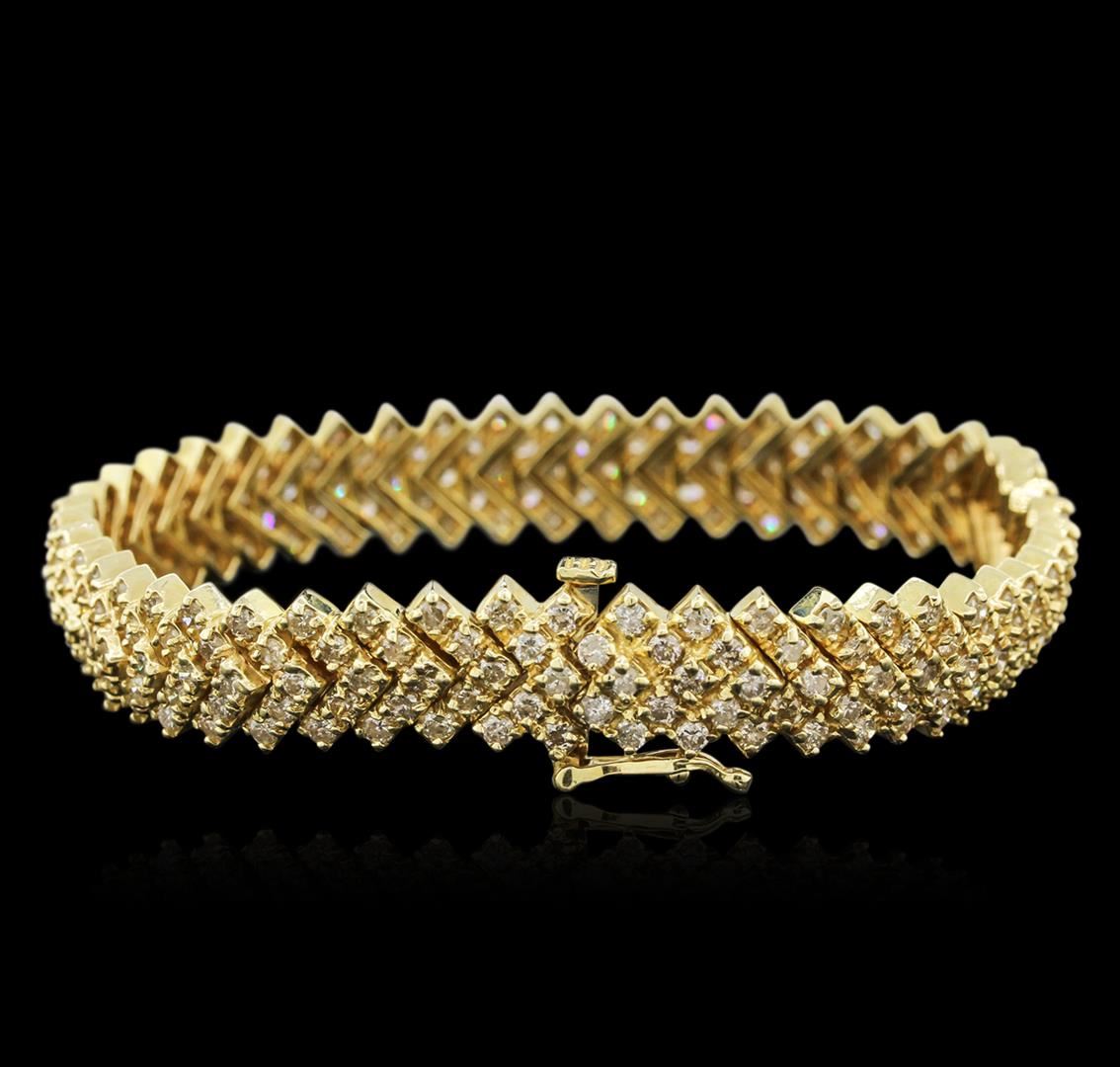 One electronically tested 14KT yellow gold ladies cast diamond bracelet with a hidden box clasp with safety closer with a bright polish finish. Measurements: 7" in length Identified with markings of "14K". Condition is very good. Containing: Two Hundred Fifty prong set round brilliant cut diamonds, measuring 1.60 - 1.60 x 0.96mm (depth est.) approximate total weight of 250 Stones = 3.73ct. Clarity: SI-2 to I-2. Color: I - J, Cut is Good. All diamonds are graded in the mounting, unless otherwise stated. Total Weight of Diamonds 3.73ct. Total Weight of Bracelet 27.50 grams. GGL Appraised at $8,180.00.