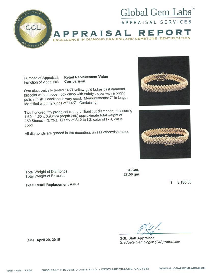 One electronically tested 14KT yellow gold ladies cast diamond bracelet with a hidden box clasp with safety closer with a bright polish finish. Measurements: 7" in length Identified with markings of "14K". Condition is very good. Containing: Two Hundred Fifty prong set round brilliant cut diamonds, measuring 1.60 - 1.60 x 0.96mm (depth est.) approximate total weight of 250 Stones = 3.73ct. Clarity: SI-2 to I-2. Color: I - J, Cut is Good. All diamonds are graded in the mounting, unless otherwise stated. Total Weight of Diamonds 3.73ct. Total Weight of Bracelet 27.50 grams. GGL Appraised at $8,180.00.