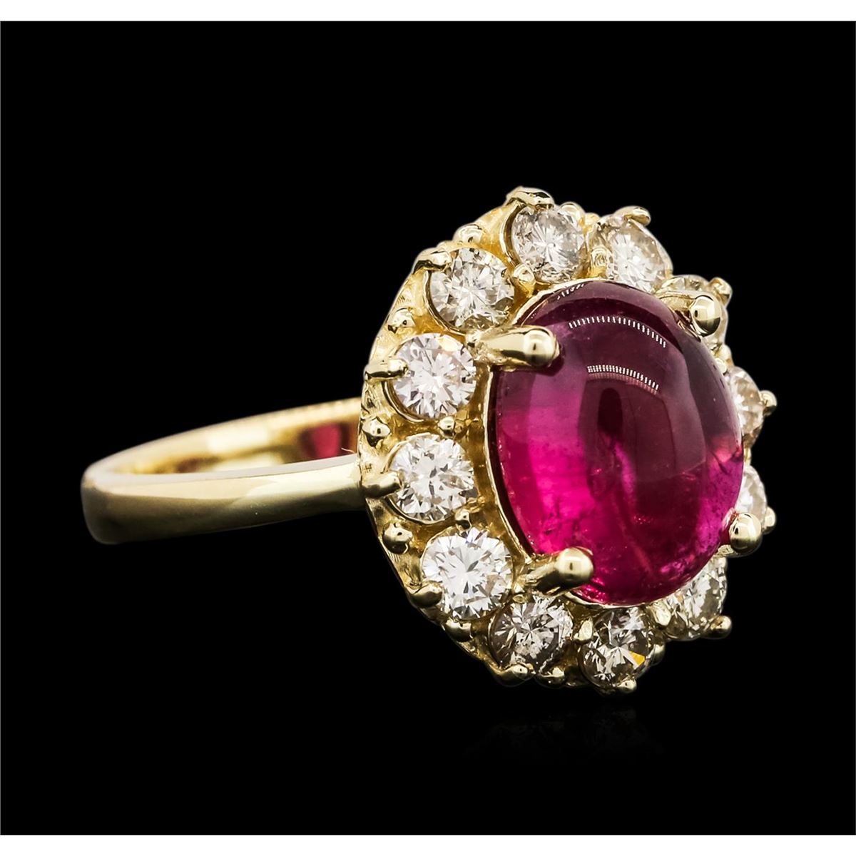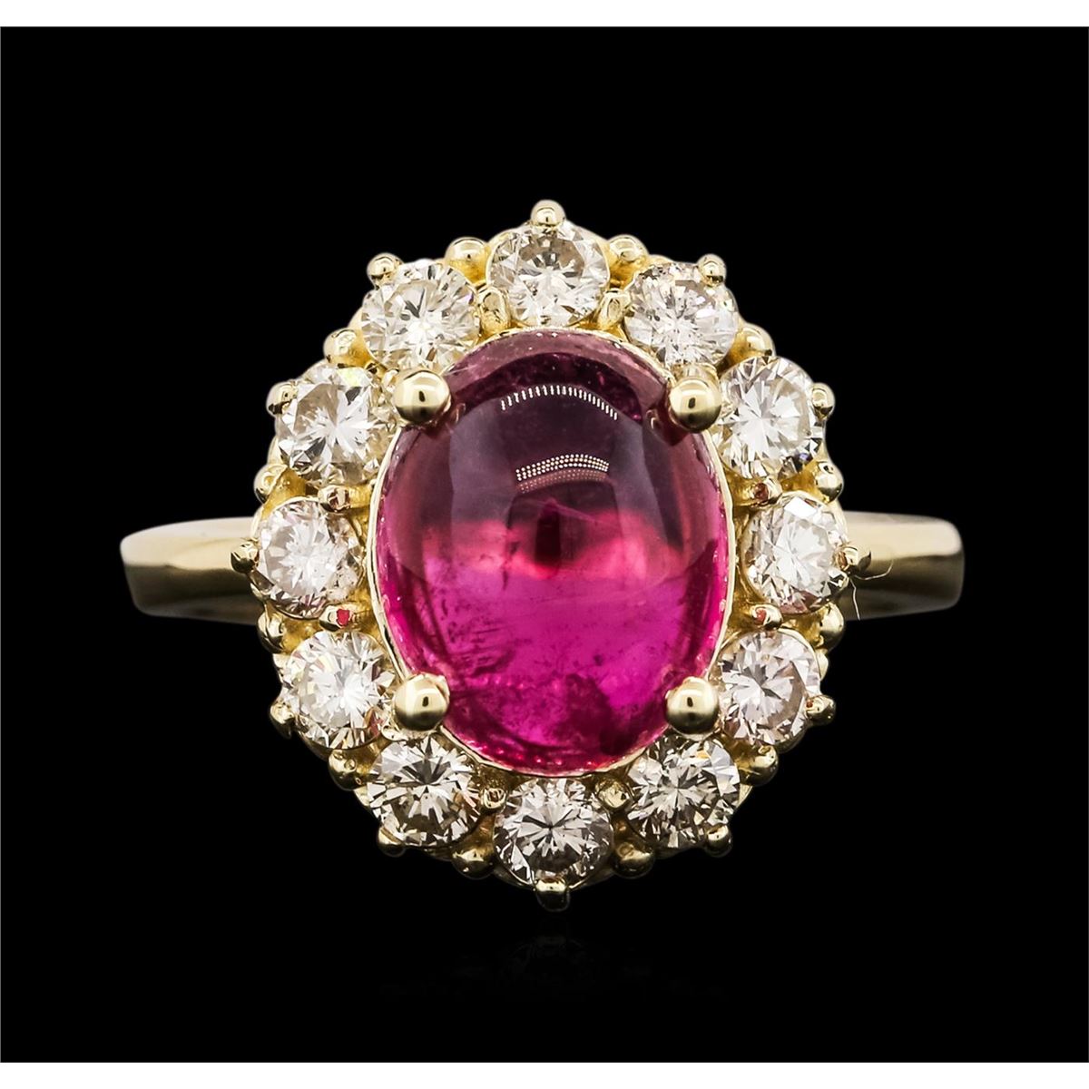 One electronically tested 14KT yellow gold ladies cast rubellite tourmaline and diamond ring with a bright polish finish. The featured rubellite tourmaline is set within a diamond bezel, completed by a two and one-half millimeter wide band. Identified with markings of "K14". Condition is new, good workmanship. Containing: One prong set oval cabochon cut natural rubellite, measuring 10.50 x 8.35 x 4.75mm, 6% bulge factor, approximate weight of 3.75ct., clarity is moderately included, type III, medium dark, moderately strong, slightly purplish red color, (GIA slpR 6/4), cut is good. Transmitting light with a minimum of distortion, transparent. Naturally occurring internal & external characteristics are present. Refractive index spot testing results of 1.62. This is a conclusive result for tourmaline. Graded in the setting. Twelve prong set round brilliant cut diamonds, measuring 2.70 - 2.60 x 1.59mm (depth est.) approximate total weight of 12 Stones = 0.91ct. Graded in the setting. Clarity: VS-2 to SI-2. Color: I - K. Total Weight of Colored Stones 3.75ct. Total Weight of Diamonds 0.91ct. Total Weight of Ring 5.41 grams. AIG Appraised at $5,545.00.