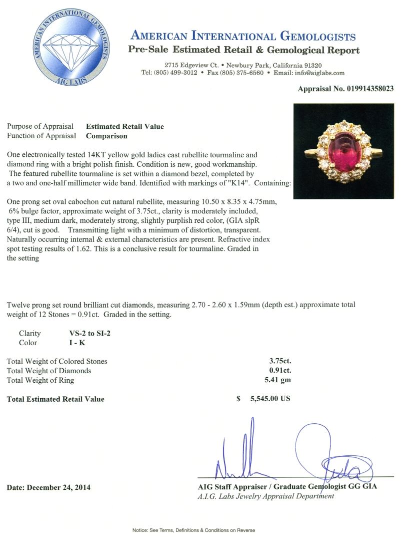 One electronically tested 14KT yellow gold ladies cast rubellite tourmaline and diamond ring with a bright polish finish. The featured rubellite tourmaline is set within a diamond bezel, completed by a two and one-half millimeter wide band. Identified with markings of "K14". Condition is new, good workmanship. Containing: One prong set oval cabochon cut natural rubellite, measuring 10.50 x 8.35 x 4.75mm, 6% bulge factor, approximate weight of 3.75ct., clarity is moderately included, type III, medium dark, moderately strong, slightly purplish red color, (GIA slpR 6/4), cut is good. Transmitting light with a minimum of distortion, transparent. Naturally occurring internal & external characteristics are present. Refractive index spot testing results of 1.62. This is a conclusive result for tourmaline. Graded in the setting. Twelve prong set round brilliant cut diamonds, measuring 2.70 - 2.60 x 1.59mm (depth est.) approximate total weight of 12 Stones = 0.91ct. Graded in the setting. Clarity: VS-2 to SI-2. Color: I - K. Total Weight of Colored Stones 3.75ct. Total Weight of Diamonds 0.91ct. Total Weight of Ring 5.41 grams. AIG Appraised at $5,545.00.