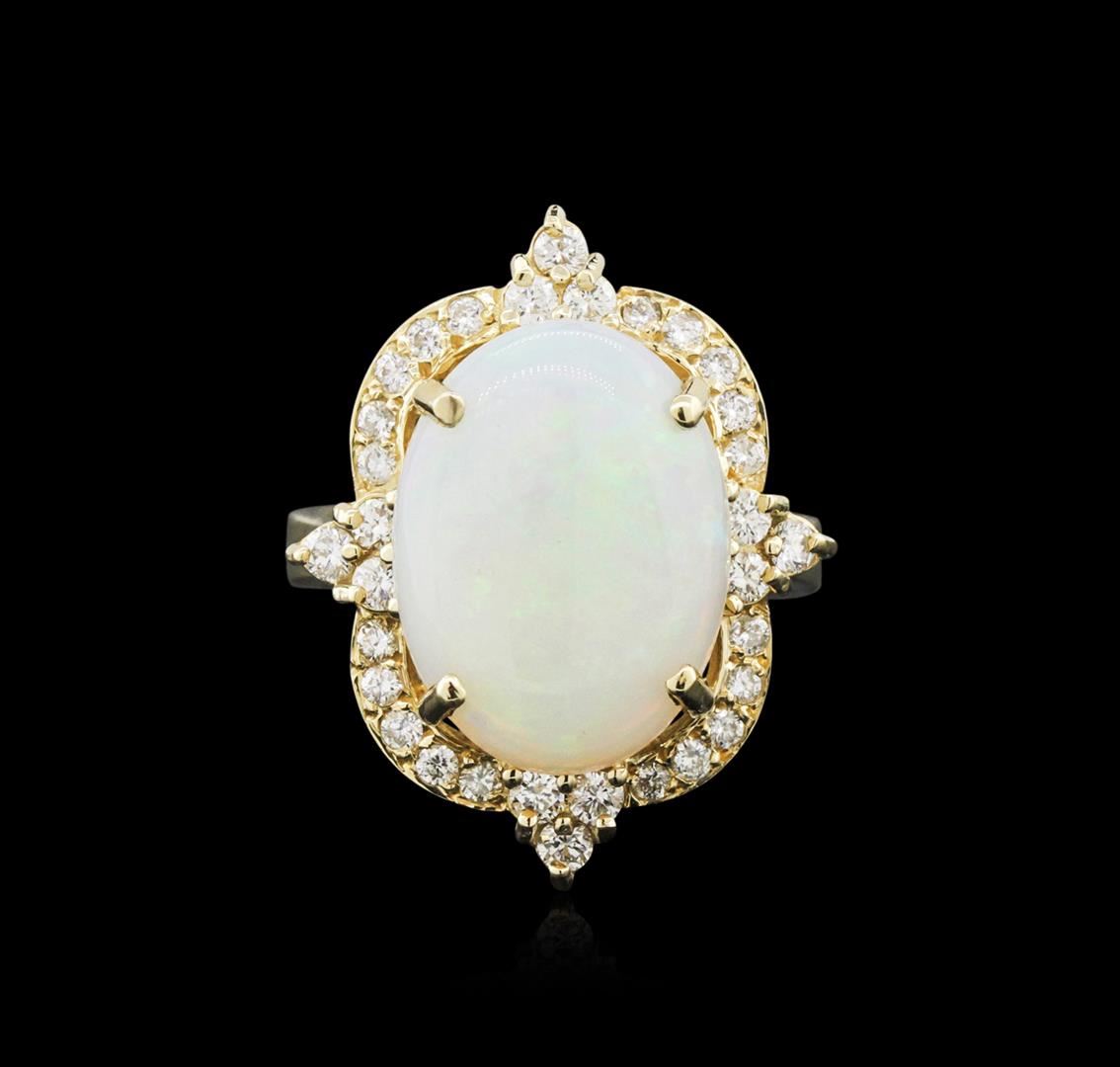 One electronically tested 14KT yellow gold ladies cast opal and diamond ring with a bright polish finish. Identified with markings of "14K". Condition is new. Containing: Thirty-Two prong set round brilliant cut diamonds, measuring 1.80 - 1.70 x 1.05mm (depth est.) approximate total weight of 32 Stones = 0.63ct. Clarity: SI-1 to SI-2. Color: K - L, Cut is Good. One white opal that is cut in a oval shape and is prong set, measuring 16.00 mm long x 12.00 mm wide, and 4.50 mm thick and the approximate weight is 3.79 carats. The opal has a somewhat bright, blue-green play of color (fire) in a flashfire pattern; a medium dome; a good cut; no inclusions; consistent in its brightness and pattern; and is somewhat directional. Colored gemstones are presumed to have been subjected to commonly used enhancement processes. All diamonds and colored gemstones are graded in the mounting, unless otherwise stated. Total Weight of Diamonds 0.63ct. Total Weight of Opals 3.79ct. Total Weight of Ring 9.30 grams. GGL Appraised at $4,015.00.