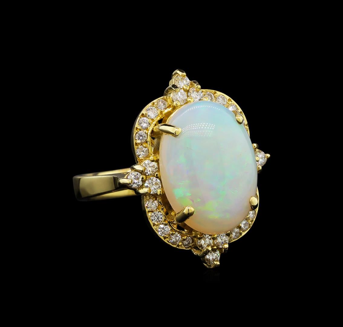 One electronically tested 14KT yellow gold ladies cast opal and diamond ring with a bright polish finish. Identified with markings of "14K". Condition is new. Containing: Thirty-Two prong set round brilliant cut diamonds, measuring 1.80 - 1.70 x 1.05mm (depth est.) approximate total weight of 32 Stones = 0.63ct. Clarity: SI-1 to SI-2. Color: K - L, Cut is Good. One white opal that is cut in a oval shape and is prong set, measuring 16.00 mm long x 12.00 mm wide, and 4.50 mm thick and the approximate weight is 3.79 carats. The opal has a somewhat bright, blue-green play of color (fire) in a flashfire pattern; a medium dome; a good cut; no inclusions; consistent in its brightness and pattern; and is somewhat directional. Colored gemstones are presumed to have been subjected to commonly used enhancement processes. All diamonds and colored gemstones are graded in the mounting, unless otherwise stated. Total Weight of Diamonds 0.63ct. Total Weight of Opals 3.79ct. Total Weight of Ring 9.30 grams. GGL Appraised at $4,015.00.