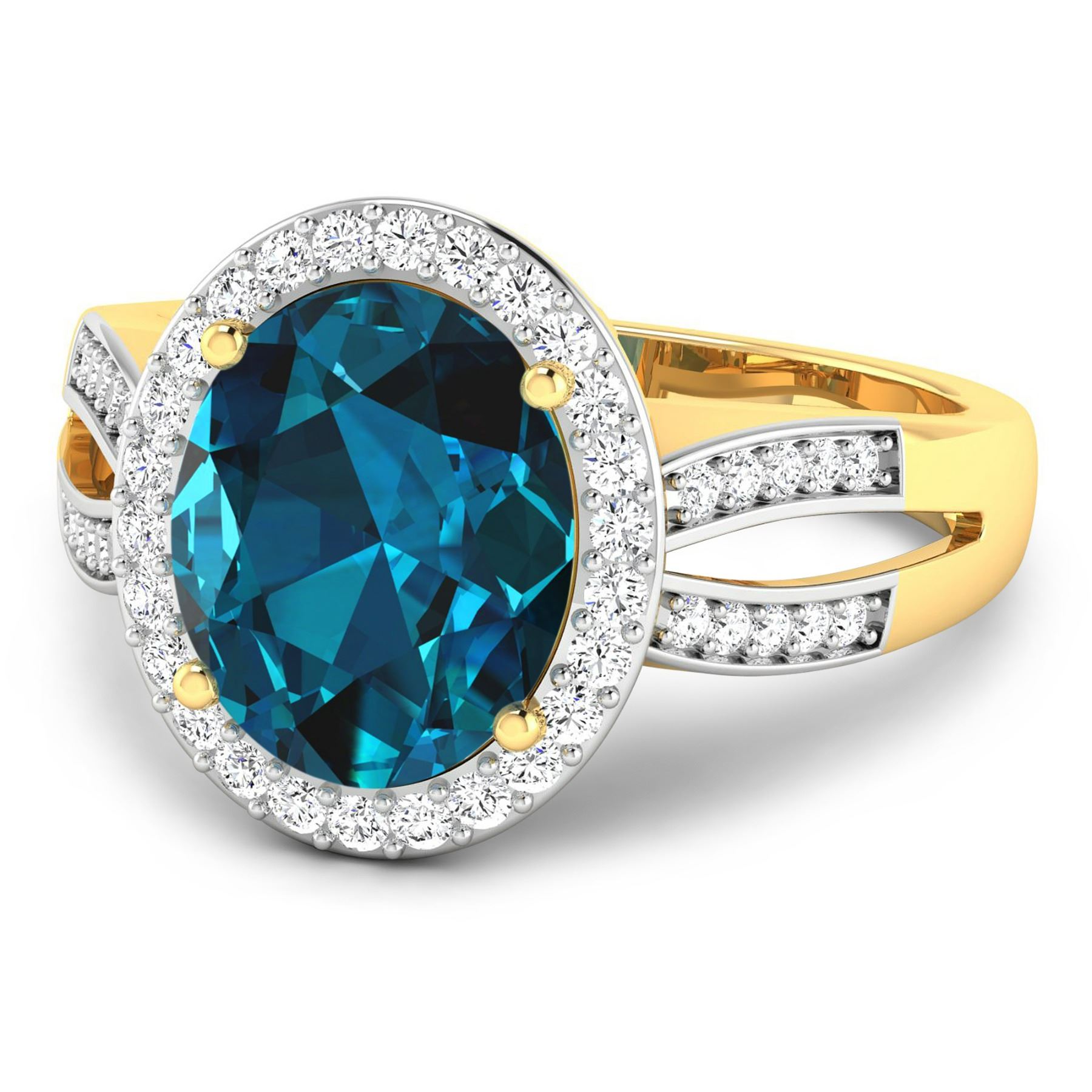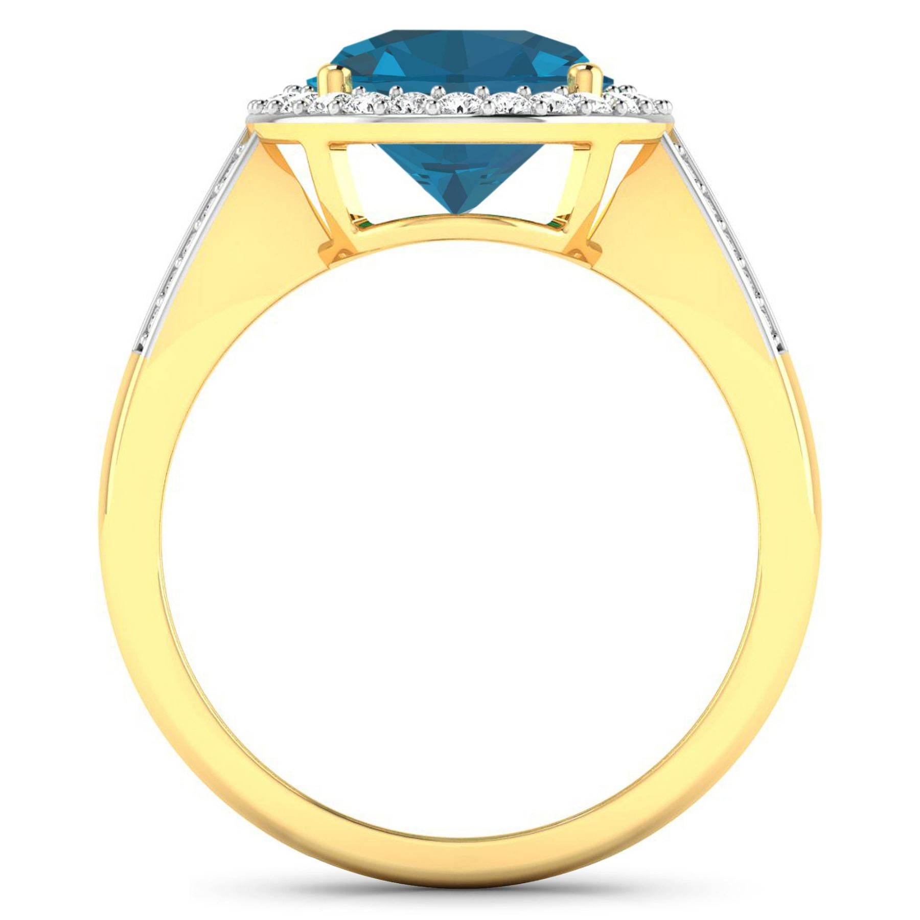London Blue Topaz Oval 11x9mm - 1Pc + White Diamond F/C Round 1.30mm - 26Pcs + White Diamond F/C Round 1.10mm - 20Pcs ( White Pan Rhodium ) ( SI-2/HI ) Total weight of gemstone is 3.7cts. Total Diamond weight is 0.39cts. Total weight of this ring is 4.42 grams. Ring size 7.