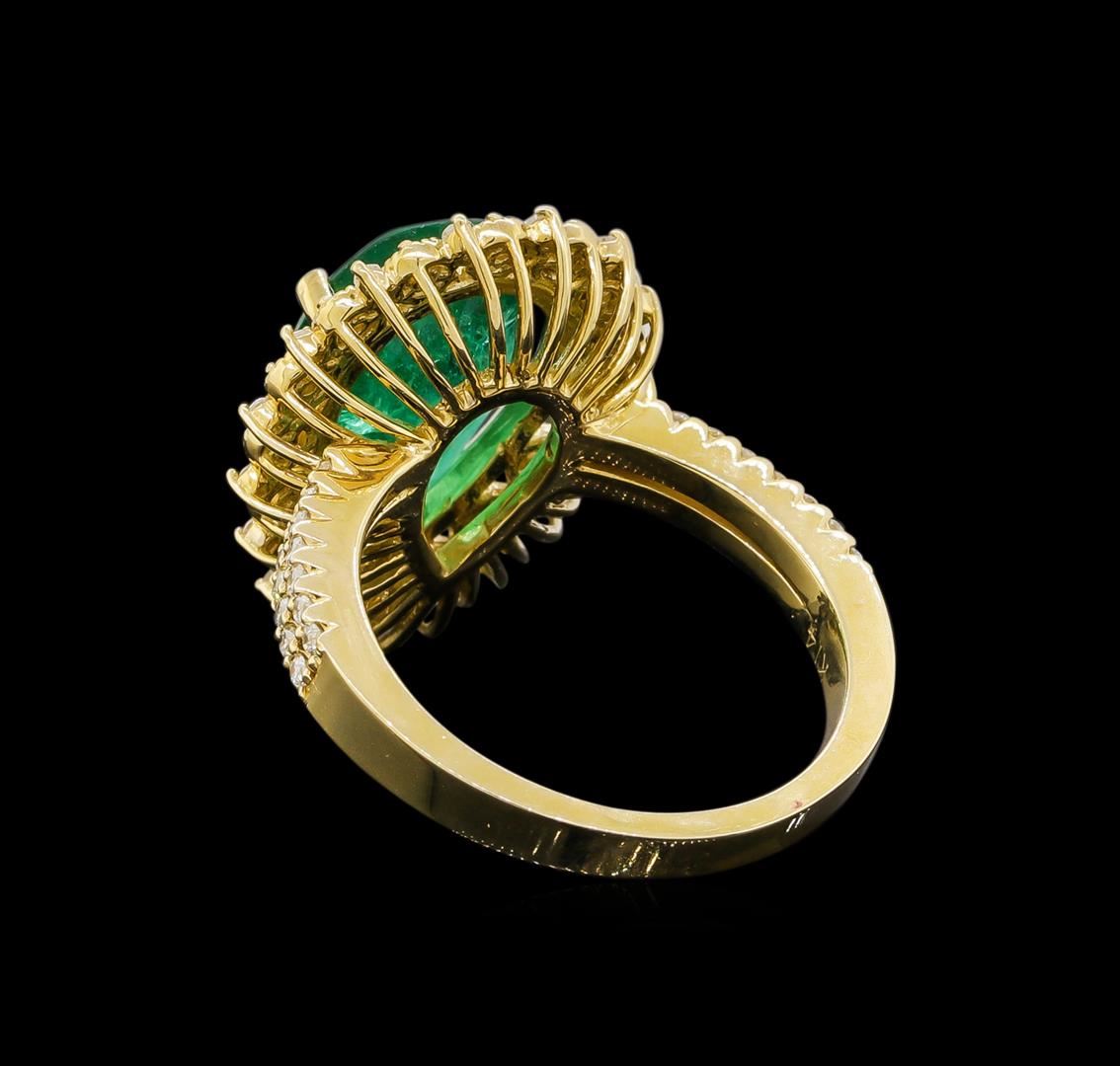 One electronically tested 14KT yellow gold ladies cast emerald and diamond ring with a bright polish finish. Identified with markings of "14K". Condition is new. Containing: One prong set pear modified brilliant cut natural emerald, measuring 15.00 x 9.00 x 5.20mm, approximate weight of 3.82ct., clarity is heavily included, type III, medium dark, moderately strong, green color, (GIA G 6/4), cut is good. Sixty-One prong set round brilliant cut diamonds, measuring 1.30 - 1.00 x 0.69mm (depth est.) approximate total weight of 61 Stones = 0.34ct. Clarity: SI-2 to I-2. Color: J, Cut is Good. Colored gemstones are presumed to have been subjected to commonly used enhancement processes. All diamonds and colored gemstones are graded in the mounting, unless otherwise stated. Total Weight of Colored Stones 3.82ct. Total Weight of Diamonds 0.34ct. Total Weight of Ring 6.50 grams. GGL Appraised at $6,455.00.