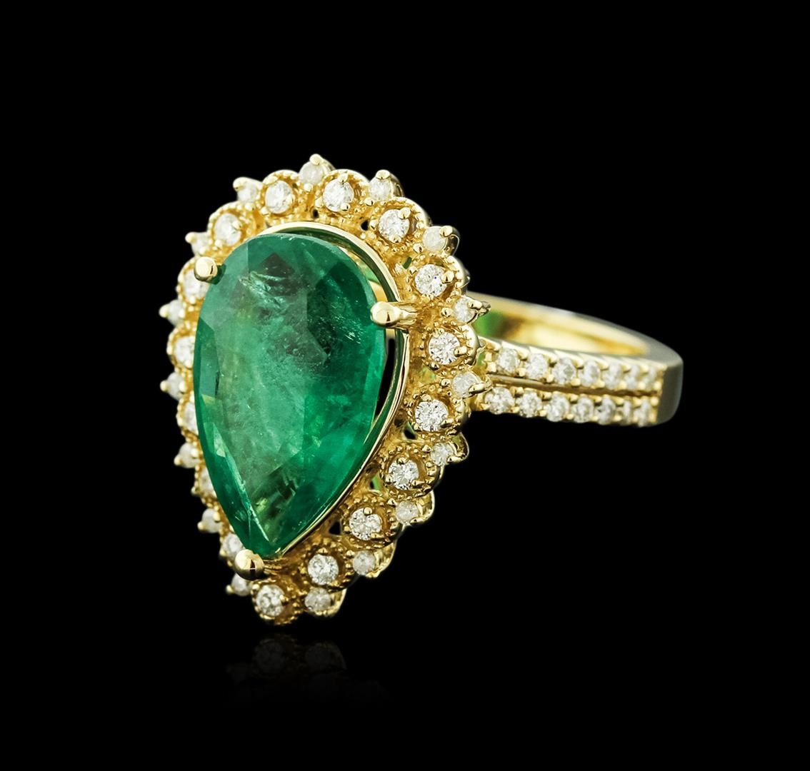 One electronically tested 14KT yellow gold ladies cast emerald and diamond ring with a bright polish finish. Identified with markings of "14K". Condition is new. Containing: One prong set pear modified brilliant cut natural emerald, measuring 15.00 x 9.00 x 5.20mm, approximate weight of 3.82ct., clarity is heavily included, type III, medium dark, moderately strong, green color, (GIA G 6/4), cut is good. Sixty-One prong set round brilliant cut diamonds, measuring 1.30 - 1.00 x 0.69mm (depth est.) approximate total weight of 61 Stones = 0.34ct. Clarity: SI-2 to I-2. Color: J, Cut is Good. Colored gemstones are presumed to have been subjected to commonly used enhancement processes. All diamonds and colored gemstones are graded in the mounting, unless otherwise stated. Total Weight of Colored Stones 3.82ct. Total Weight of Diamonds 0.34ct. Total Weight of Ring 6.50 grams. GGL Appraised at $6,455.00.