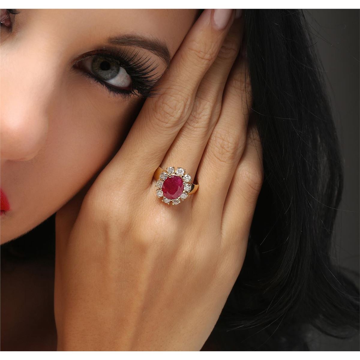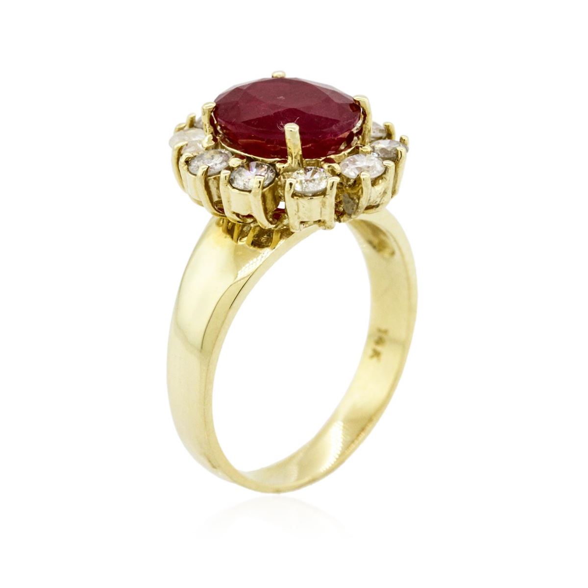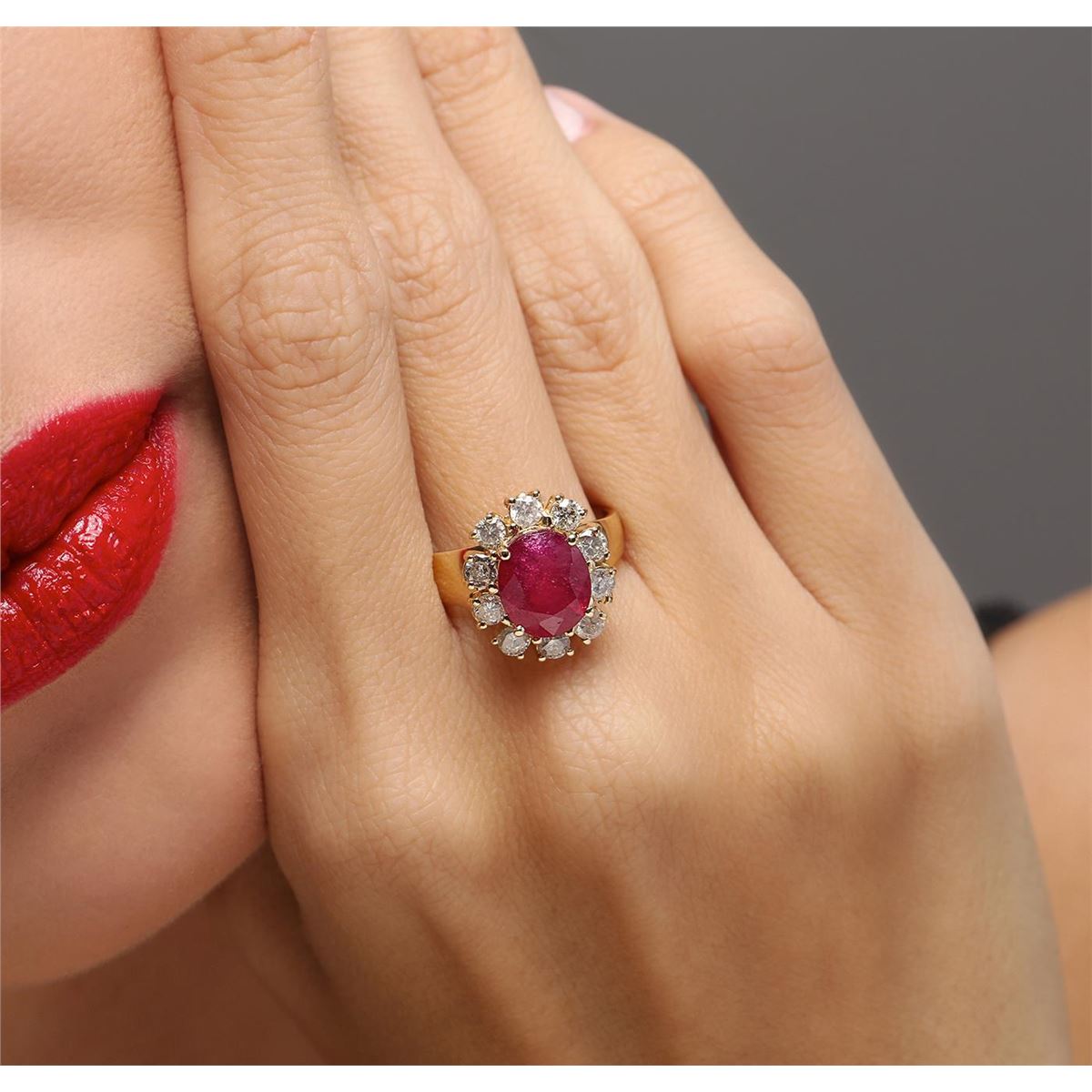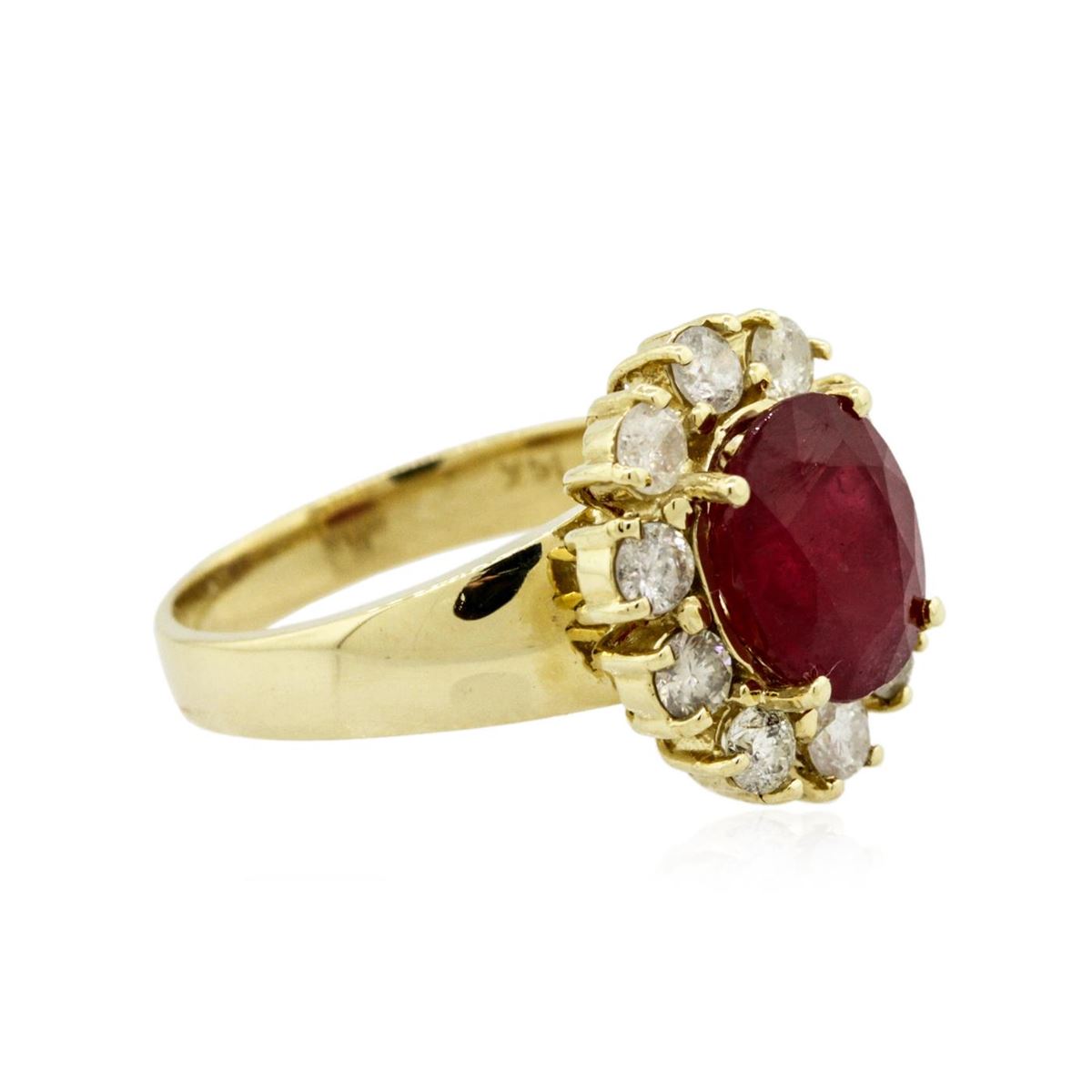 One electronically tested 14KT yellow gold ladies cast ruby and diamond ring with a bright polish finish. The featured ruby is set within a diamond bezel, completed by a three millimeter wide band. Identified with markings of "14K". Condition is new, good workmanship. Containing: One prong set oval mixed cut natural ruby, measuring 9.70 x 8.20 x 5.55mm, 8% bulge factor, approximate weight of 3.84ct., clarity is heavily included, type II, medium dark, very slightly brownish, slightly purplish red color, (GIA slpR 6/3), cut is good. Transmitting light somewhat diffusely, transparent to translucent. Naturally occurring internal & external characteristics are present. Indications of laboratory high temperature heat treatment, with glass & flux additives. Graded in the setting. Ruby has a low tolerance to rhodium plating, repolishing the surface, & ultrasonic cleaning. Ten prong set round brilliant cut diamonds, measuring 3.10 - 3.00 x 1.83mm (depth est.) approximate total weight of 10 Stones = 1.13ct. Graded in the setting. Clarity: I-1 to I-2. Color: I - K. Total Weight of Colored Stones 3.84ct. Total Weight of Diamonds 1.13ct. Total Weight of Ring 6.59 grams. AIG Appraised at $3,740.00.