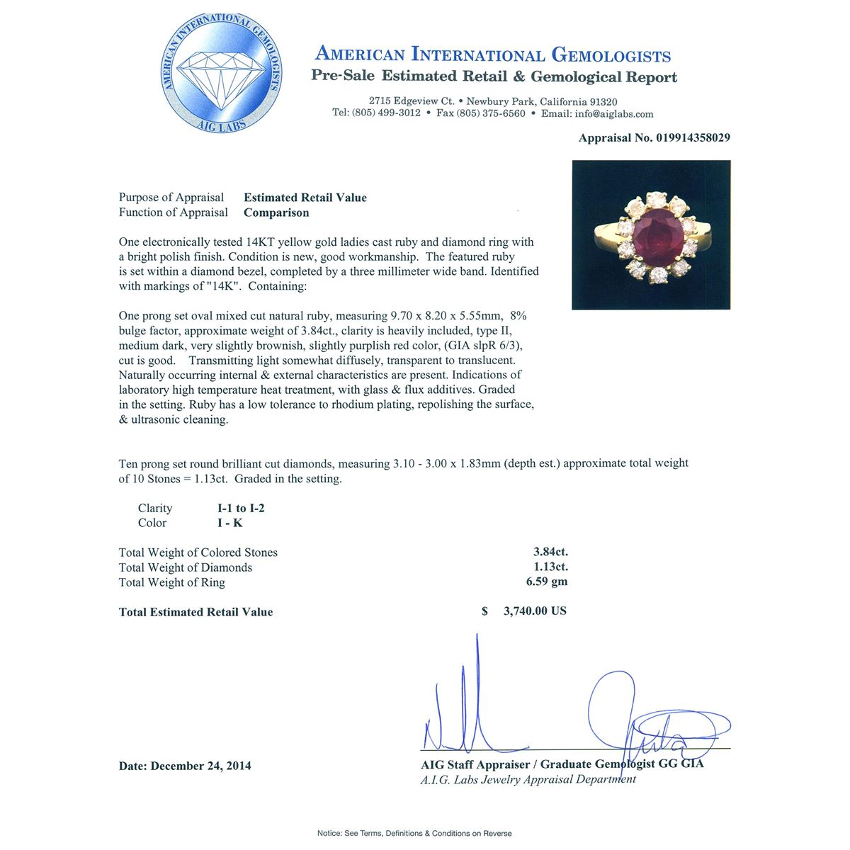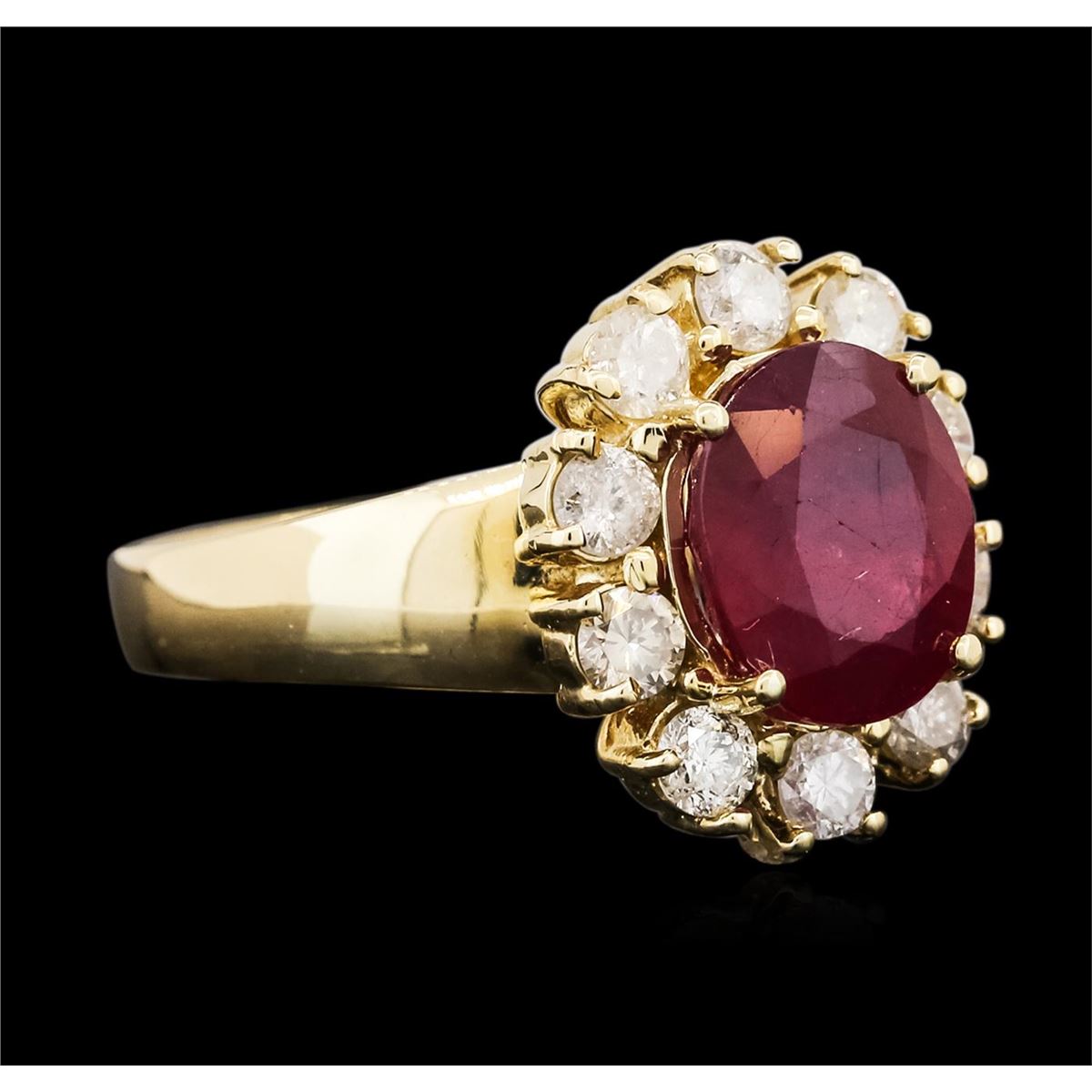 One electronically tested 14KT yellow gold ladies cast ruby and diamond ring with a bright polish finish. The featured ruby is set within a diamond bezel, completed by a three millimeter wide band. Identified with markings of "14K". Condition is new, good workmanship. Containing: One prong set oval mixed cut natural ruby, measuring 9.70 x 8.20 x 5.55mm, 8% bulge factor, approximate weight of 3.84ct., clarity is heavily included, type II, medium dark, very slightly brownish, slightly purplish red color, (GIA slpR 6/3), cut is good. Transmitting light somewhat diffusely, transparent to translucent. Naturally occurring internal & external characteristics are present. Indications of laboratory high temperature heat treatment, with glass & flux additives. Graded in the setting. Ruby has a low tolerance to rhodium plating, repolishing the surface, & ultrasonic cleaning. Ten prong set round brilliant cut diamonds, measuring 3.10 - 3.00 x 1.83mm (depth est.) approximate total weight of 10 Stones = 1.13ct. Graded in the setting. Clarity: I-1 to I-2. Color: I - K. Total Weight of Colored Stones 3.84ct. Total Weight of Diamonds 1.13ct. Total Weight of Ring 6.59 grams. AIG Appraised at $3,740.00.