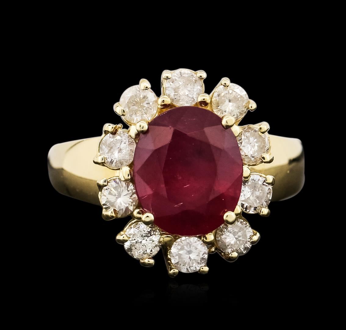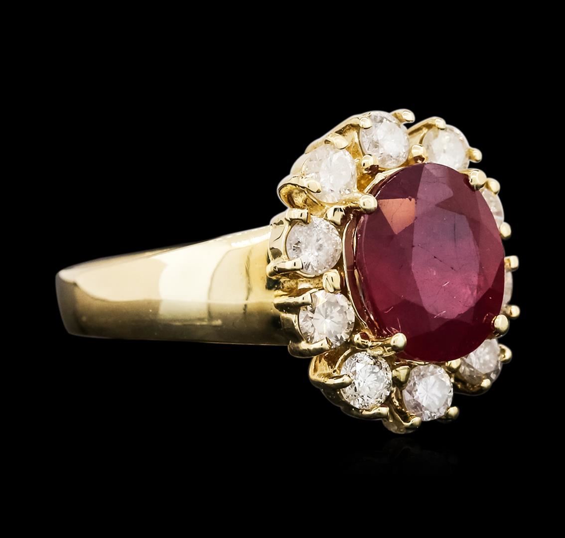 One electronically tested 14KT yellow gold ladies cast ruby and diamond ring with a bright polish finish. The featured ruby is set within a diamond bezel, completed by a three millimeter wide band. Identified with markings of "14K". Condition is new, good workmanship. Containing: One prong set oval mixed cut natural ruby, measuring 9.70 x 8.20 x 5.55mm, 8% bulge factor, approximate weight of 3.84ct., clarity is heavily included, type II, medium dark, very slightly brownish, slightly purplish red color, (GIA slpR 6/3), cut is good. Transmitting light somewhat diffusely, transparent to translucent. Naturally occurring internal & external characteristics are present. Indications of laboratory high temperature heat treatment, with glass & flux additives. Graded in the setting. Ruby has a low tolerance to rhodium plating, repolishing the surface, & ultrasonic cleaning. Ten prong set round brilliant cut diamonds, measuring 3.10 - 3.00 x 1.83mm (depth est.) approximate total weight of 10 Stones = 1.13ct. Graded in the setting. Clarity: I-1 to I-2. Color: I - K. Total Weight of Colored Stones 3.84ct. Total Weight of Diamonds 1.13ct. Total Weight of Ring 6.59 grams. AIG Appraised at $3,740.00.