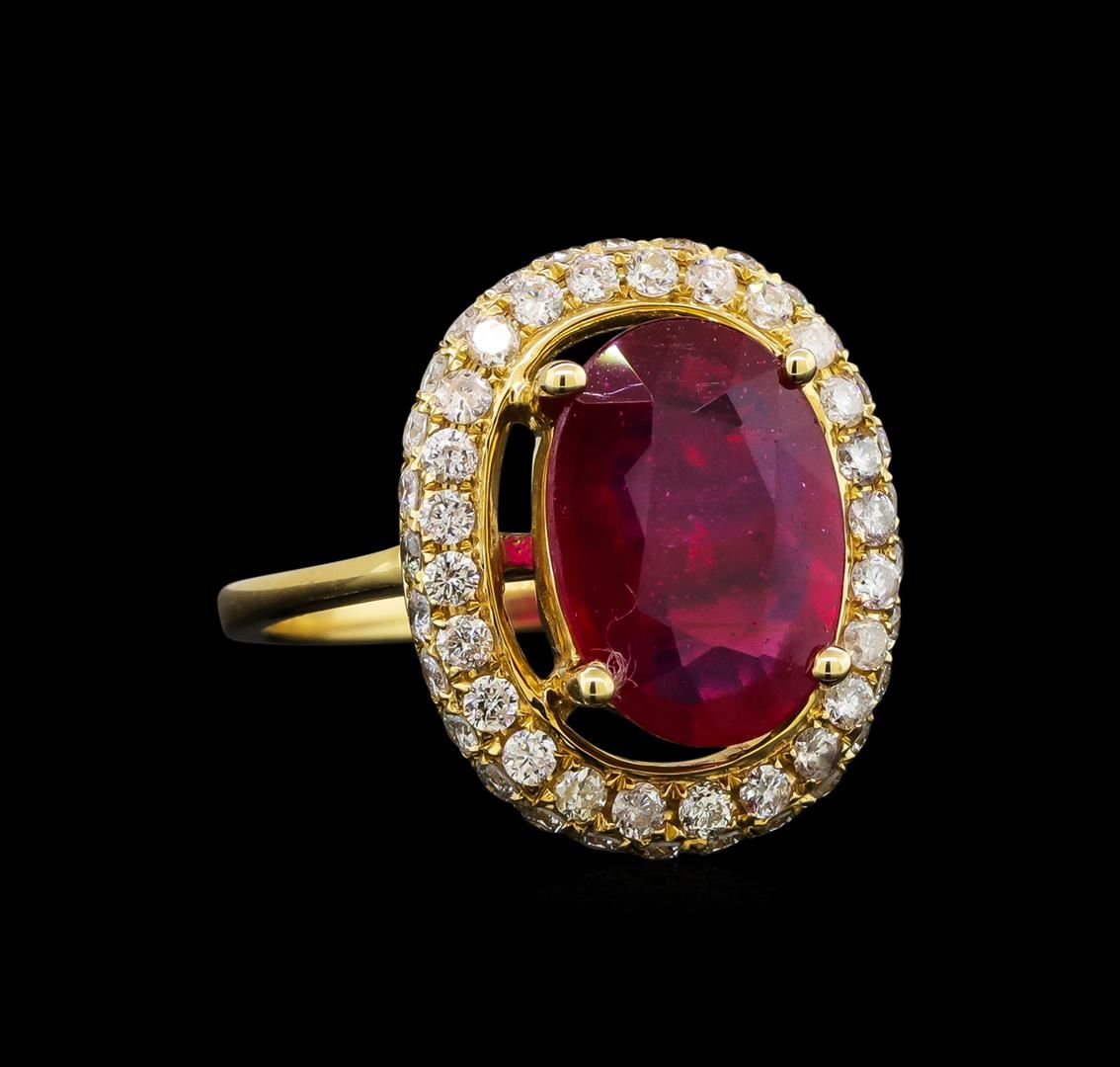 One electronically tested 14KT yellow gold ladies cast ruby and diamond ring with a cathedral shank with a bright polish finish. Trademark is Orianne. Identified with markings of "14K". Condition is new. Containing: One prong set oval modified brilliant cut natural ruby, measuring 12.00 x 8.00 x 4.83mm, approximate weight of 3.89ct., clarity is heavily included, type II, medium dark, very slightly brownish, strongly purplish red color, (GIA stpR 6/3), cut is good. Forty-Eight prong set round brilliant cut diamonds, measuring 1.30 - 1.30 x 0.78mm (depth est.) approximate total weight of 48 Stones = 0.38ct. Clarity: I-1 to I-2. Color: J - K. All diamonds and colored gemstones are graded in the mounting, unless otherwise stated. Colored gemstones are presumed to have been subjected to commonly used enhancement processes. Total Weight of Colored Stones 3.89ct. Total Weight of Diamonds 0.38ct. Total Weight of Ring 5.30 grams. GGL Appraised at $4,300.00.