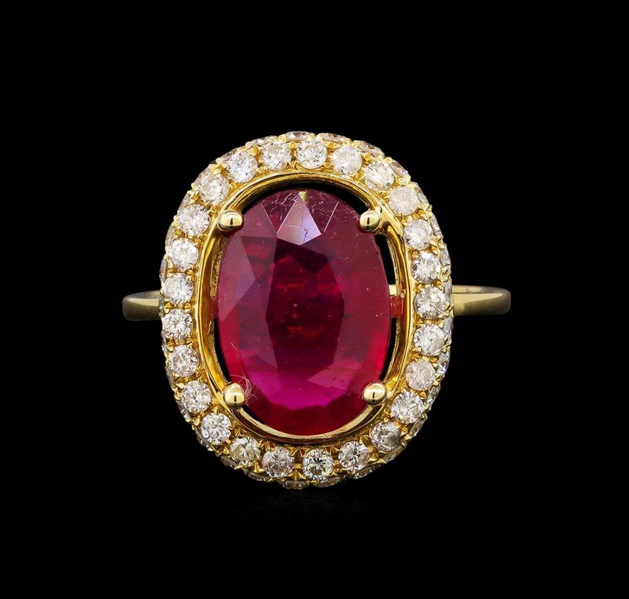 One electronically tested 14KT yellow gold ladies cast ruby and diamond ring with a cathedral shank with a bright polish finish. Trademark is Orianne. Identified with markings of "14K". Condition is new. Containing: One prong set oval modified brilliant cut natural ruby, measuring 12.00 x 8.00 x 4.83mm, approximate weight of 3.89ct., clarity is heavily included, type II, medium dark, very slightly brownish, strongly purplish red color, (GIA stpR 6/3), cut is good. Forty-Eight prong set round brilliant cut diamonds, measuring 1.30 - 1.30 x 0.78mm (depth est.) approximate total weight of 48 Stones = 0.38ct. Clarity: I-1 to I-2. Color: J - K. All diamonds and colored gemstones are graded in the mounting, unless otherwise stated. Colored gemstones are presumed to have been subjected to commonly used enhancement processes. Total Weight of Colored Stones 3.89ct. Total Weight of Diamonds 0.38ct. Total Weight of Ring 5.30 grams. GGL Appraised.