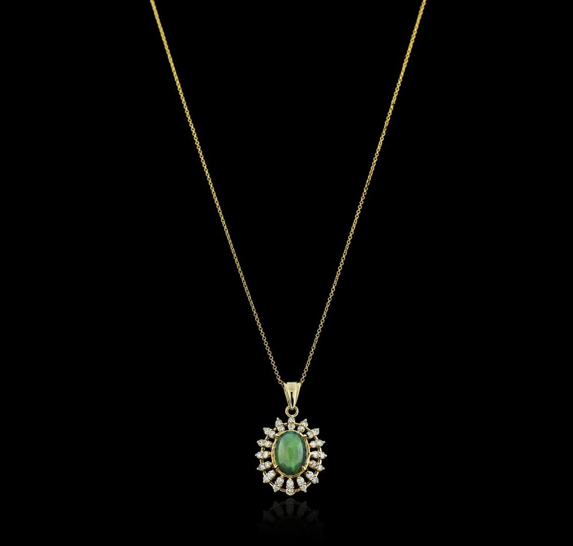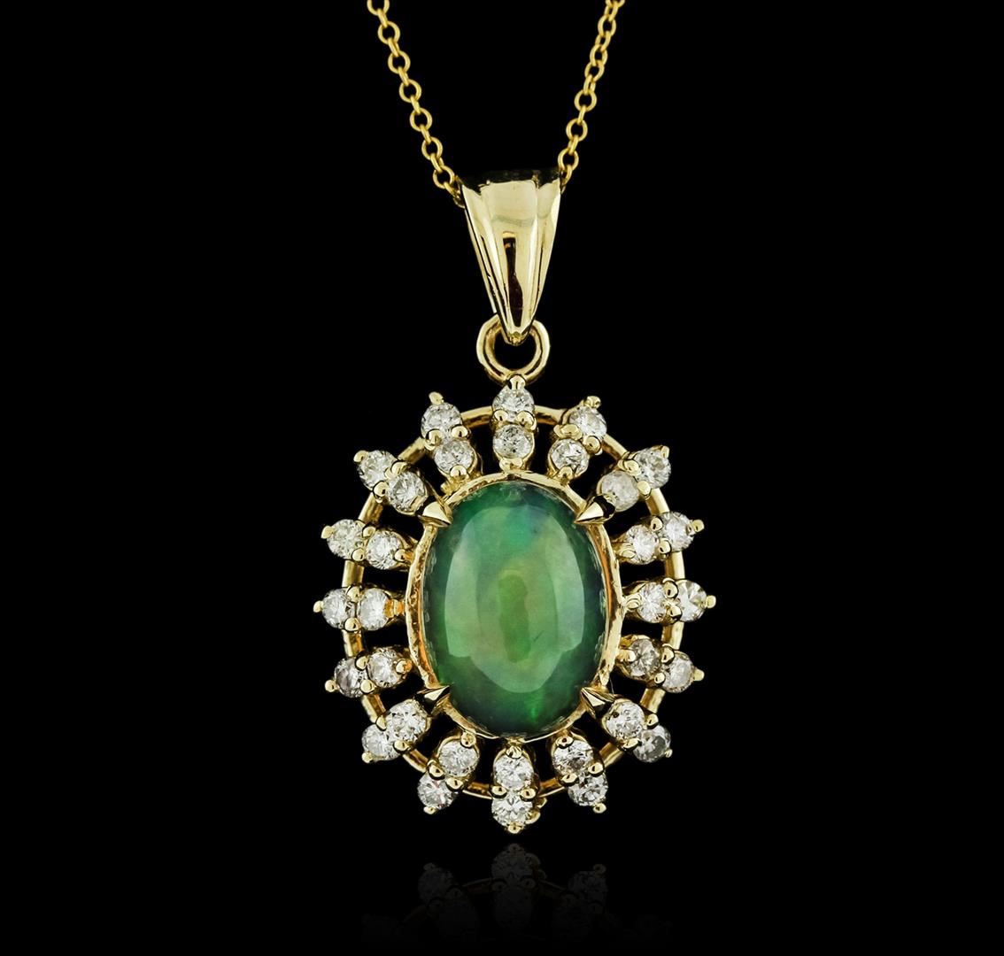 One electronically tested 14KT yellow gold ladies cast opal and diamond pendant & chain 16.0" long, thin round cable link with a spring ring clasp with a bright polish finish. Identified with markings of "14K". Condition is new. Containing: One crystal opal that is cut in a cabochon shaped cabochon and is prong set, measuring 11.51 mm long x 8.65 mm wide, and 6.27 mm thick and the approximate weight is 3.89 carats. The opal has a bright, green-orange play of color (fire) in a flashfire pattern; a high dome; a cut; no inclusions; consistent in its brightness and pattern; and is somewhat directional. Thirty-Two prong set round brilliant cut diamonds, measuring 1.50 - 1.50 x 0.90mm (depth est.) approximate total weight of 32 Stones = 0.39ct. Clarity: SI-1 to SI-2. Color: J - K, Cut is Good. All diamonds and colored gemstones are graded in the mounting, unless otherwise stated. Colored gemstones are presumed to have been subjected to commonly used enhancement processes. Total Weight of Diamonds 0.39ct. Total Weight of Opals 3.89ct. Total Weight of Pendant & Chain 5.70 grams. GGL Appraised at $3,175.00.