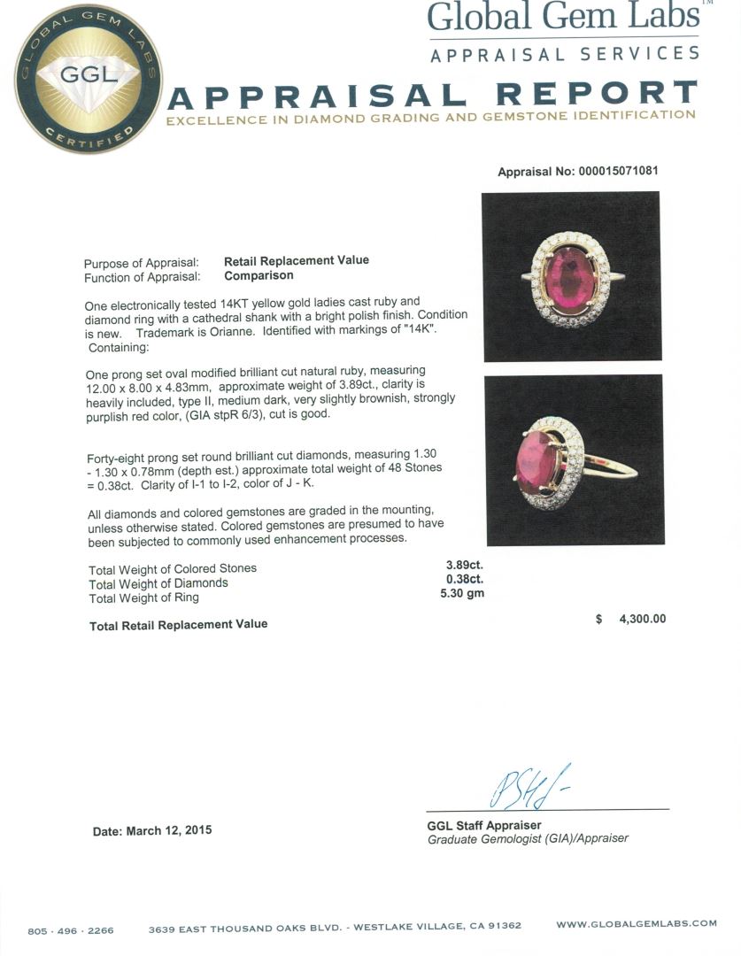One electronically tested 14KT yellow gold ladies cast ruby and diamond ring with a cathedral shank with a bright polish finish. Trademark is Orianne. Identified with markings of "14K". Condition is new. Containing: One prong set oval modified brilliant cut natural ruby, measuring 12.00 x 8.00 x 4.83mm, approximate weight of 3.89ct., clarity is heavily included, type II, medium dark, very slightly brownish, strongly purplish red color, (GIA stpR 6/3), cut is good. Forty-Eight prong set round brilliant cut diamonds, measuring 1.30 - 1.30 x 0.78mm (depth est.) approximate total weight of 48 Stones = 0.38ct. Clarity: I-1 to I-2. Color: J - K. All diamonds and colored gemstones are graded in the mounting, unless otherwise stated. Colored gemstones are presumed to have been subjected to commonly used enhancement processes. Total Weight of Colored Stones 3.89ct. Total Weight of Diamonds 0.38ct. Total Weight of Ring 5.30 grams. GGL Appraised at $4,300.00.