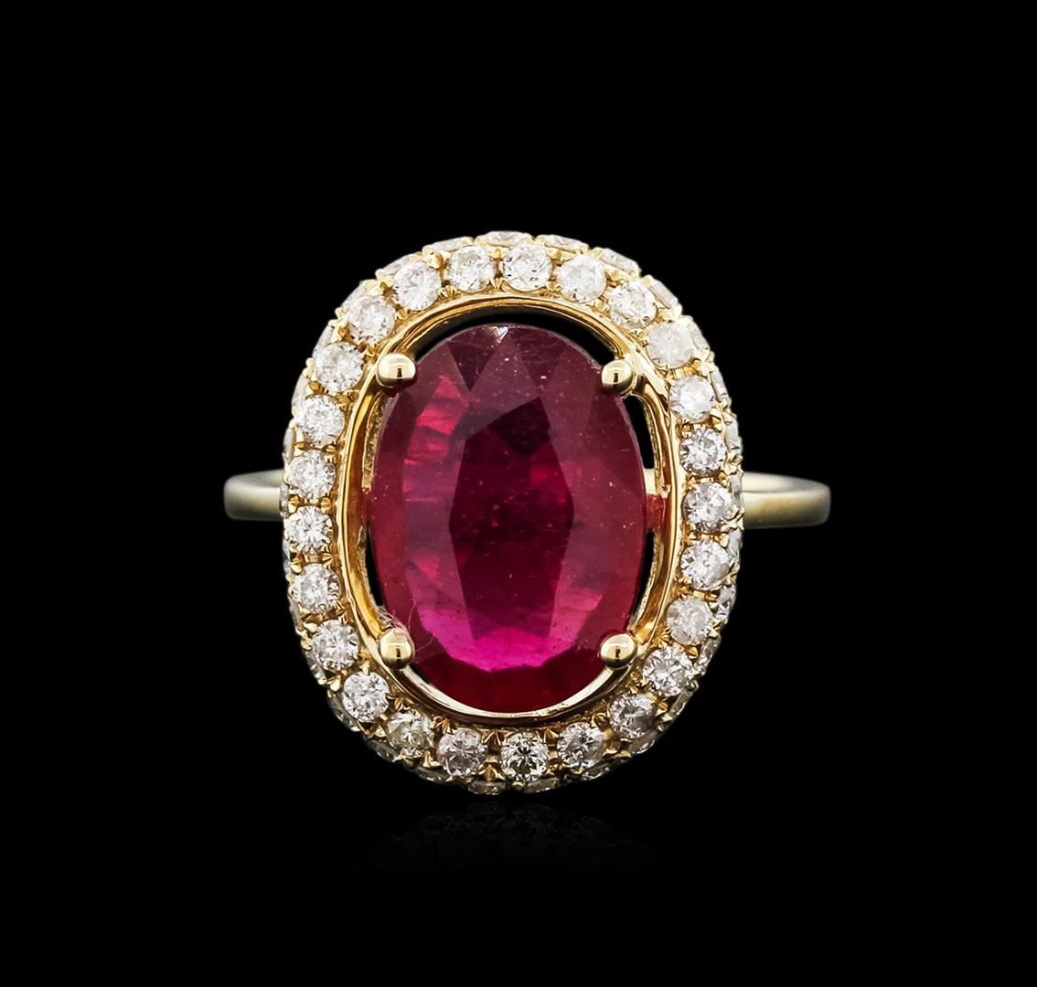 One electronically tested 14KT yellow gold ladies cast ruby and diamond ring with a cathedral shank with a bright polish finish. Trademark is Orianne. Identified with markings of "14K". Condition is new. Containing: One prong set oval modified brilliant cut natural ruby, measuring 12.00 x 8.00 x 4.83mm, approximate weight of 3.89ct., clarity is heavily included, type II, medium dark, very slightly brownish, strongly purplish red color, (GIA stpR 6/3), cut is good. Forty-Eight prong set round brilliant cut diamonds, measuring 1.30 - 1.30 x 0.78mm (depth est.) approximate total weight of 48 Stones = 0.38ct. Clarity: I-1 to I-2. Color: J - K. All diamonds and colored gemstones are graded in the mounting, unless otherwise stated. Colored gemstones are presumed to have been subjected to commonly used enhancement processes. Total Weight of Colored Stones 3.89ct. Total Weight of Diamonds 0.38ct. Total Weight of Ring 5.30 grams. GGL Appraised at $4,300.00.