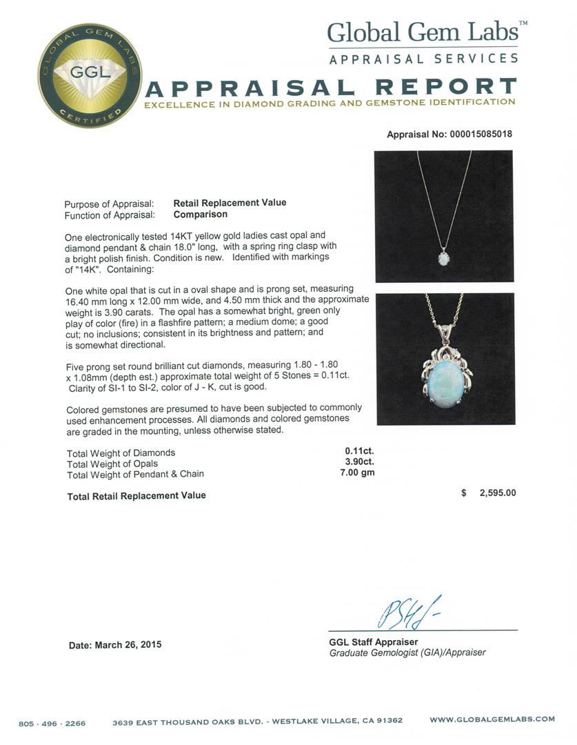 One electronically tested 14KT yellow gold ladies cast opal and diamond pendant & chain 18.0" long, with a spring ring clasp with a bright polish finish. Identified with markings of "14K". Condition is new. Containing: One white opal that is cut in a oval shape and is prong set, measuring 16.40 mm long x 12.00 mm wide, and 4.50 mm thick and the approximate weight is 3.90 carats. The opal has a somewhat bright, green only play of color (fire) in a flashfire pattern; a medium dome; a good cut; no inclusions; consistent in its brightness and pattern; and is somewhat directional. Five prong set round brilliant cut diamonds, measuring 1.80 - 1.80 x 1.08mm (depth est.) approximate total weight of 5 Stones = 0.11ct. Clarity: SI-1 to SI-2. Color: J - K, Cut is Good. Colored gemstones are presumed to have been subjected to commonly used enhancement processes. All diamonds and colored gemstones are graded in the mounting, unless otherwise stated. Total Weight of Diamonds 0.11ct. Total Weight of Opals 3.90ct. Total Weight of Pendant & Chain 7.00 grams. GGL Appraised at $2,595.00.