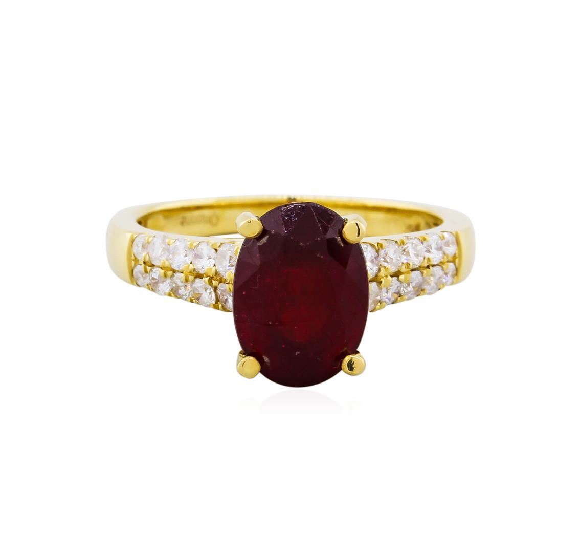 14KT yellow gold ruby and diamond ring. An oval cut ruby corundum gemstone weighing in at an aproximate 3.94 carats is prong mounted in the center of the ring. Approximately 0.44 carats of round brilliant cut diamonds accent the ring around the center gemstones and on both sides. The ring is cast stamped "14K" and has a gross weight of 4.8 grams. Finish: High polish. Condition: Excellent GGA Appraised at $4,340.00.