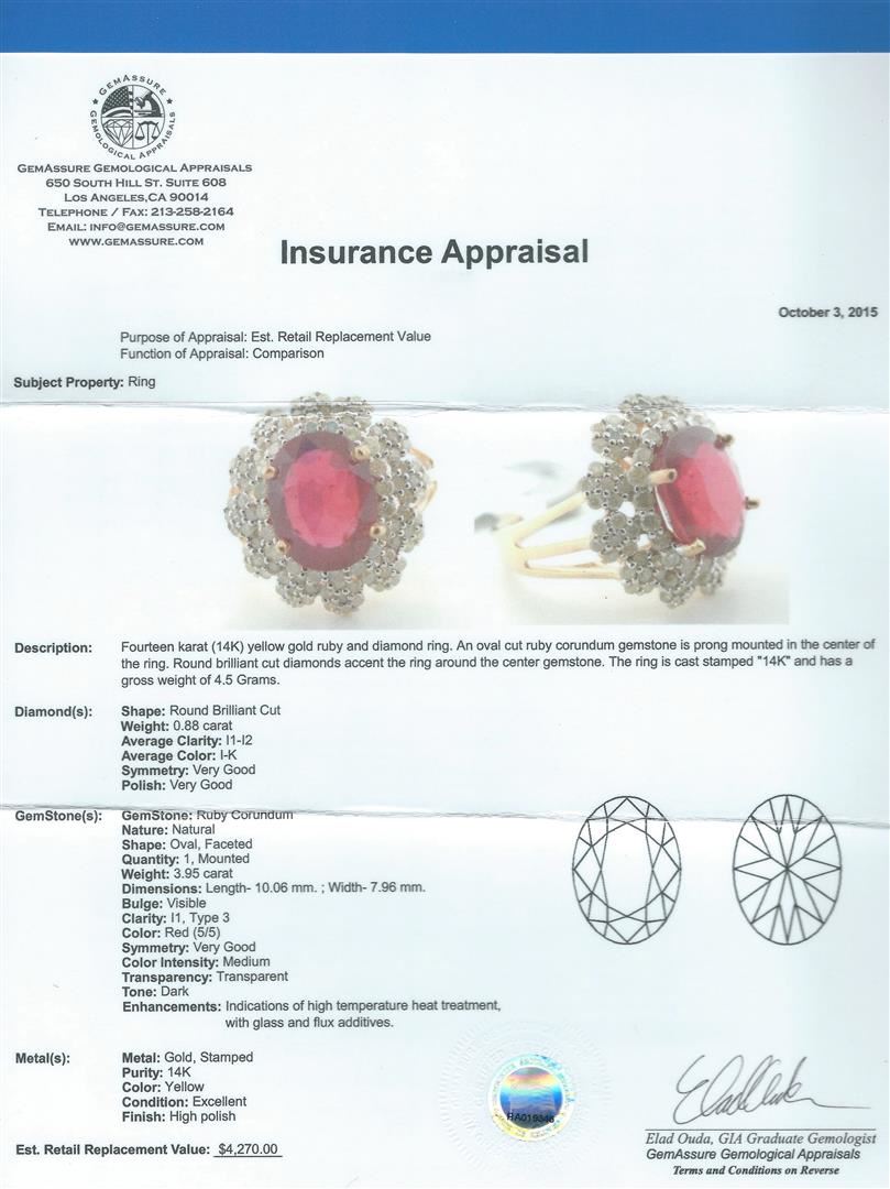 14KT yellow gold ruby and diamond ring. An oval cut ruby corundum gemstone weighing in at an aproximate 3.95 carats is prong mounted in the center of the ring. Approximately 0.88 carats of round brilliant cut diamonds accent the ring around the center gemstones and create a beautiful floral design. The ring is cast stamped "14K" and has a gross weight of 4.5 grams. Finish: High polish. Condition: Excellent GGA Appraised at $4,270.00.