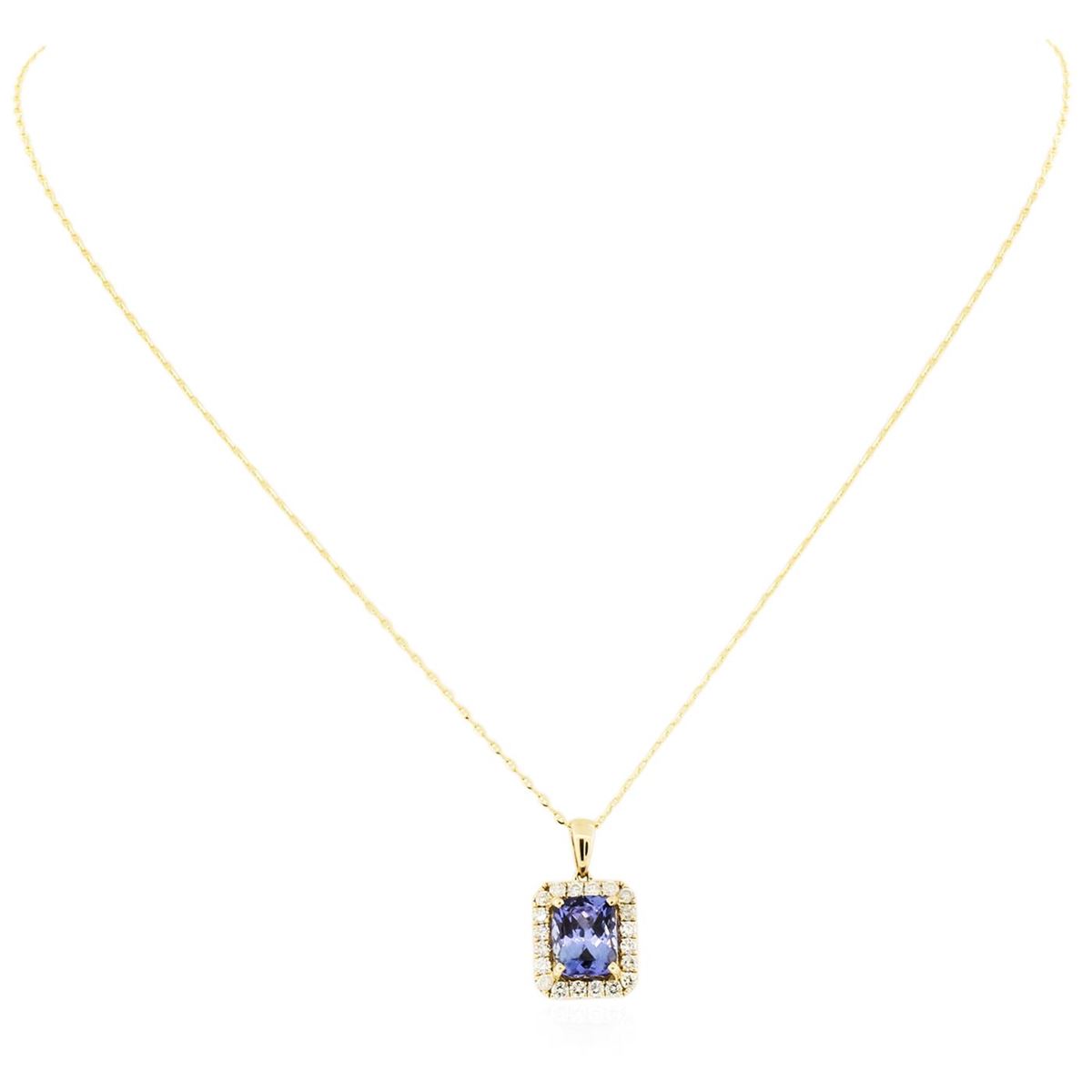 One electronically tested 14KT yellow gold ladies cast & assembled tanzanite and diamond pendant with chain. The pendant features a tanzanite set within a diamond bezel, completed by a yellow gold bail. The pendant is supported by an eighteen inch length 14KT yellow gold designer style chain, terminating in a spring ring clasp. Bright polish finish. Trademark is Orianne. Identified with markings of "14K". Condition is new, good workmanship. Containing: One prong set rectangular cushion mixed cut natural tanzanite, measuring 10.00 x 7.90 x 6.00mm, 6% bulge factor, approximate weight of 3.96ct., clarity is eye clean, type I, medium dark, very slightly grayish, bluish violet color, (GIA bV 6/3), cut is good. Transmitting light with no distortion, transparent. Graded in the setting. Tanzanite is a very rare gemstone that is only found in the country of Tanzania. Originally discovered in 1967. Tiffany & Company, named the stone Tanzanite. It is found in the Usumburu Mountains that border the Umba Valley of northern Tanzania. Tanzanite occurs in gray, brown, violet, blue, reddish-purple, & green. The gem is interesting because of its exceptional pleochroism. Rotated in different directions a tanzanite will exhibit multiple changes of color. Tanzanite has a low tolerance to ultrasonic cleaning, and should not be cleaned using this method. Twenty prong set round brilliant cut diamonds, measuring 2.20 - 2.10 x 1.29mm (depth est.) approximate total weight of 20 Stones = 0.82ct. Graded in the setting. Clarity: SI-1 to I-1. Color: H - J. Total Weight of Colored Stones 3.96ct. Total Weight of Diamonds 0.82ct. Total Weight of Pendant With Chain 4.83 grams. AIG Appraised at $13,090.00.