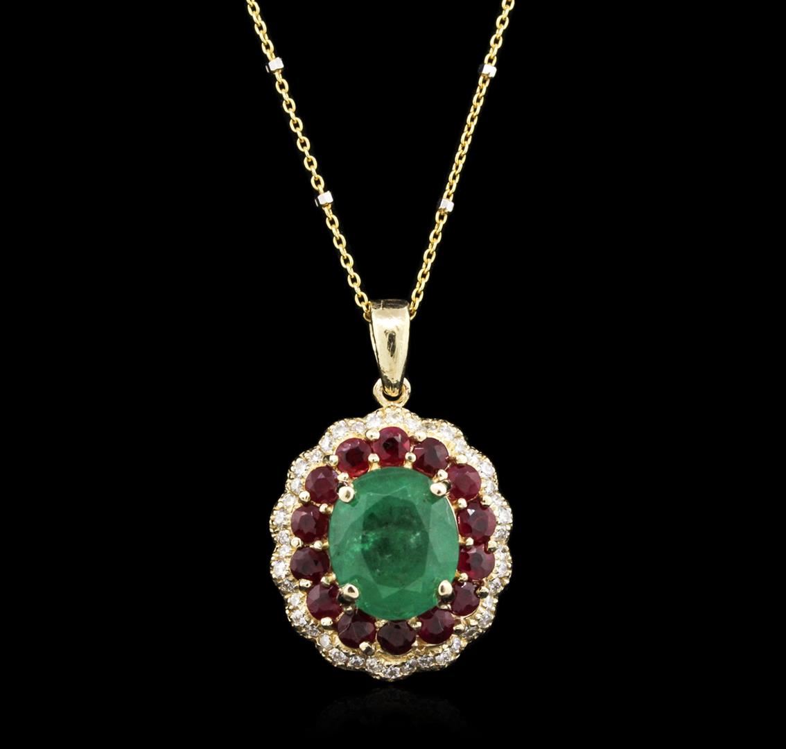 One electronically tested 14KT yellow gold ladies cast emerald, ruby and diamond pendant & chain 18.0" long, cable link with a spring ring clasp with a bright polish finish. Identified with markings of "14K". Condition is new. Containing: One prong set oval modified brilliant cut natural emerald, measuring 11.80 x 9.50 x 6.18mm, approximate weight of 3.96ct., clarity is heavily included, type III, light, slightly grayish, green color, (GIA G 3/2), cut is good. Fourteen prong set round modified brilliant cut natural rubies, measuring 3.00 - 3.00 x 1.95 mm, approximate total weight of 1.96ct., clarity is heavily included, medium dark, moderately strong, strongly purplish red color, (GIA stpR 6/4), cut is good. Forty-Two prong set round brilliant cut diamonds, measuring 1.20 - 1.20 x 0.72mm (depth est.) approximate total weight of 42 Stones = 0.27ct. Clarity: I-1. Color: I - J, Cut is Good. Colored gemstones are presumed to have been subjected to commonly used enhancement processes. All diamonds and colored gemstones are graded in the mounting, unless otherwise stated. Total Weight of Colored Stones 5.92ct. Total Weight of Diamonds 0.27ct. Total Weight of Pendant & Chain 7.90 grams. GGL Appraised at $4,650.00.