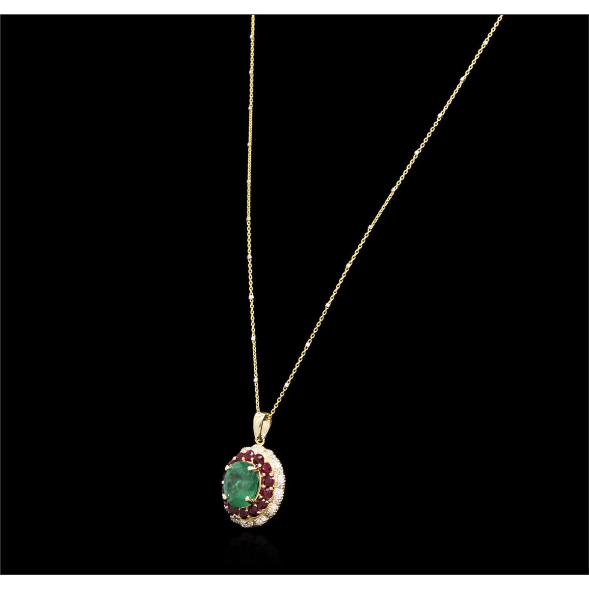 One electronically tested 14KT yellow gold ladies cast emerald, ruby and diamond pendant & chain 18.0" long, cable link with a spring ring clasp with a bright polish finish. Identified with markings of "14K". Condition is new. Containing: One prong set oval modified brilliant cut natural emerald, measuring 11.80 x 9.50 x 6.18mm, approximate weight of 3.96ct., clarity is heavily included, type III, light, slightly grayish, green color, (GIA G 3/2), cut is good. Fourteen prong set round modified brilliant cut natural rubies, measuring 3.00 - 3.00 x 1.95 mm, approximate total weight of 1.96ct., clarity is heavily included, medium dark, moderately strong, strongly purplish red color, (GIA stpR 6/4), cut is good. Forty-Two prong set round brilliant cut diamonds, measuring 1.20 - 1.20 x 0.72mm (depth est.) approximate total weight of 42 Stones = 0.27ct. Clarity: I-1. Color: I - J, Cut is Good. Colored gemstones are presumed to have been subjected to commonly used enhancement processes. All diamonds and colored gemstones are graded in the mounting, unless otherwise stated. Total Weight of Colored Stones 5.92ct. Total Weight of Diamonds 0.27ct. Total Weight of Pendant & Chain 7.90 grams. GGL Appraised at $4,650.00.