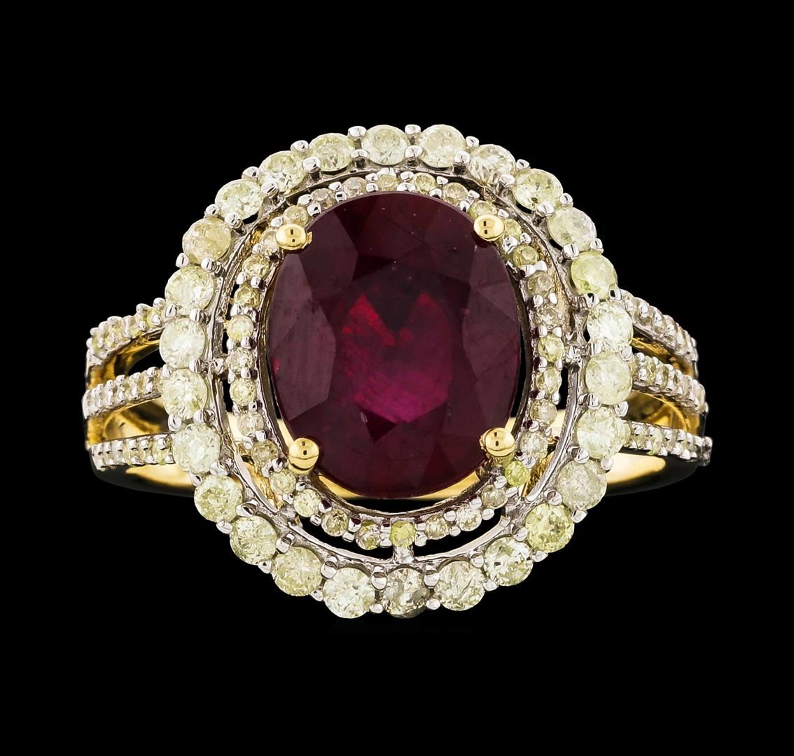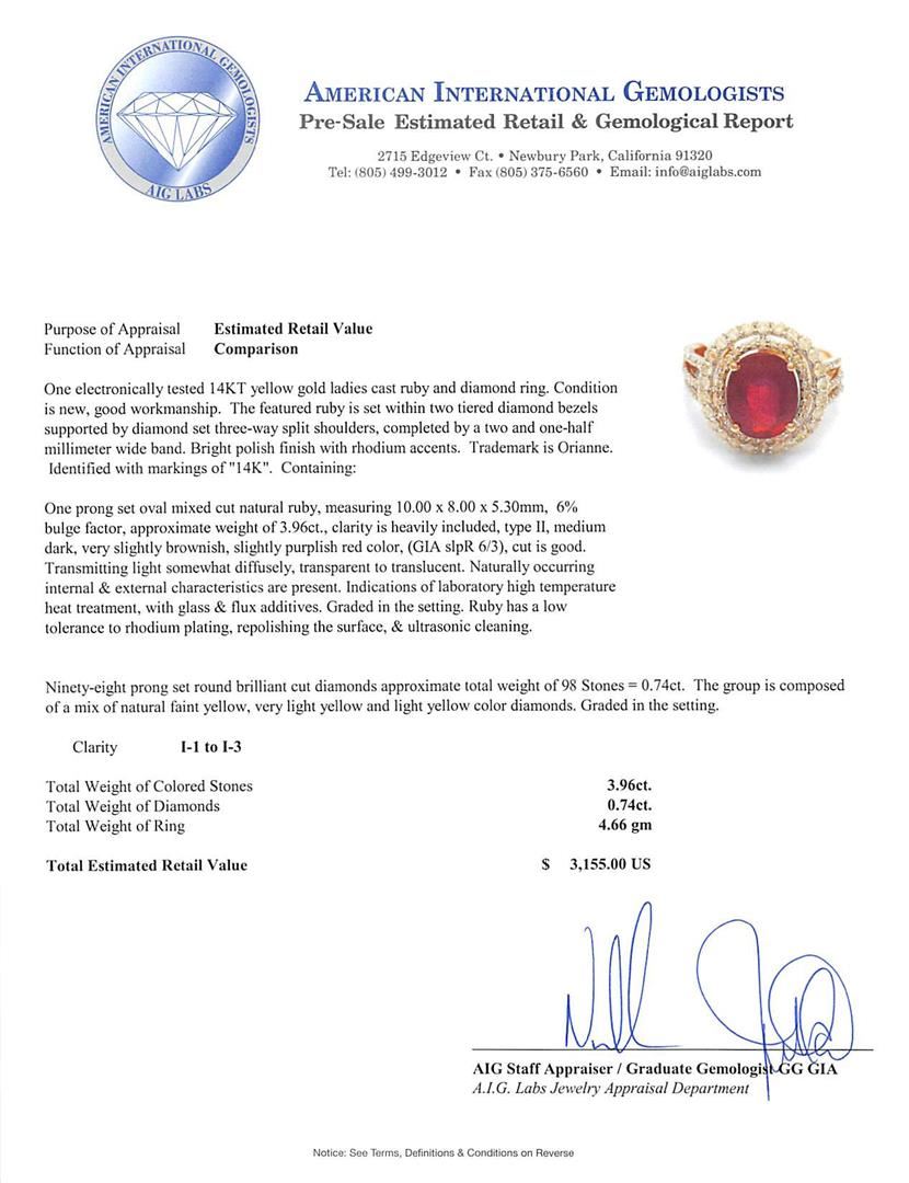 One electronically tested 14KT yellow gold ladies cast ruby and diamond ring. The featured ruby is set within a stylized diamond floret bezel supported by tapering shoulders, completed by a two and one-half millimeter wide band. Bright polish finish with rhodium accents. Trademark is Orianne. Identified with markings of "14K". Condition is new, good workmanship. Containing: One prong set oval mixed cut natural ruby, measuring 10.85 x 9.00 x 5.65mm, 6%. bulge factor, approximate weight of 5.00ct., clarity is heavily included, type II, dark, very slightly brownish, slightly purplish red color, (GIA slpR 7/3), cut is good. Transmitting light somewhat diffusely, transparent to translucent. Naturally occurring internal & external characteristics are present. Indications of laboratory high temperature heat treatment, with glass & flux additives. Graded in the setting. Ruby has a low tolerance to rhodium plating, repolishing the surface, & ultrasonic cleaning. Eighty-Four prong set round brilliant cut diamonds approximate total weight of 84 Stones = 0.94ct. The color grade reflects the entire range of color for this group. Graded in the setting. Clarity: I-1 to I-3. Color: H - K. Total Weight of Colored Stones 5.00ct. Total Weight of Diamonds 0.94ct. Total Weight of Ring 6.20gm. AIG Appraised at $3,155.00.