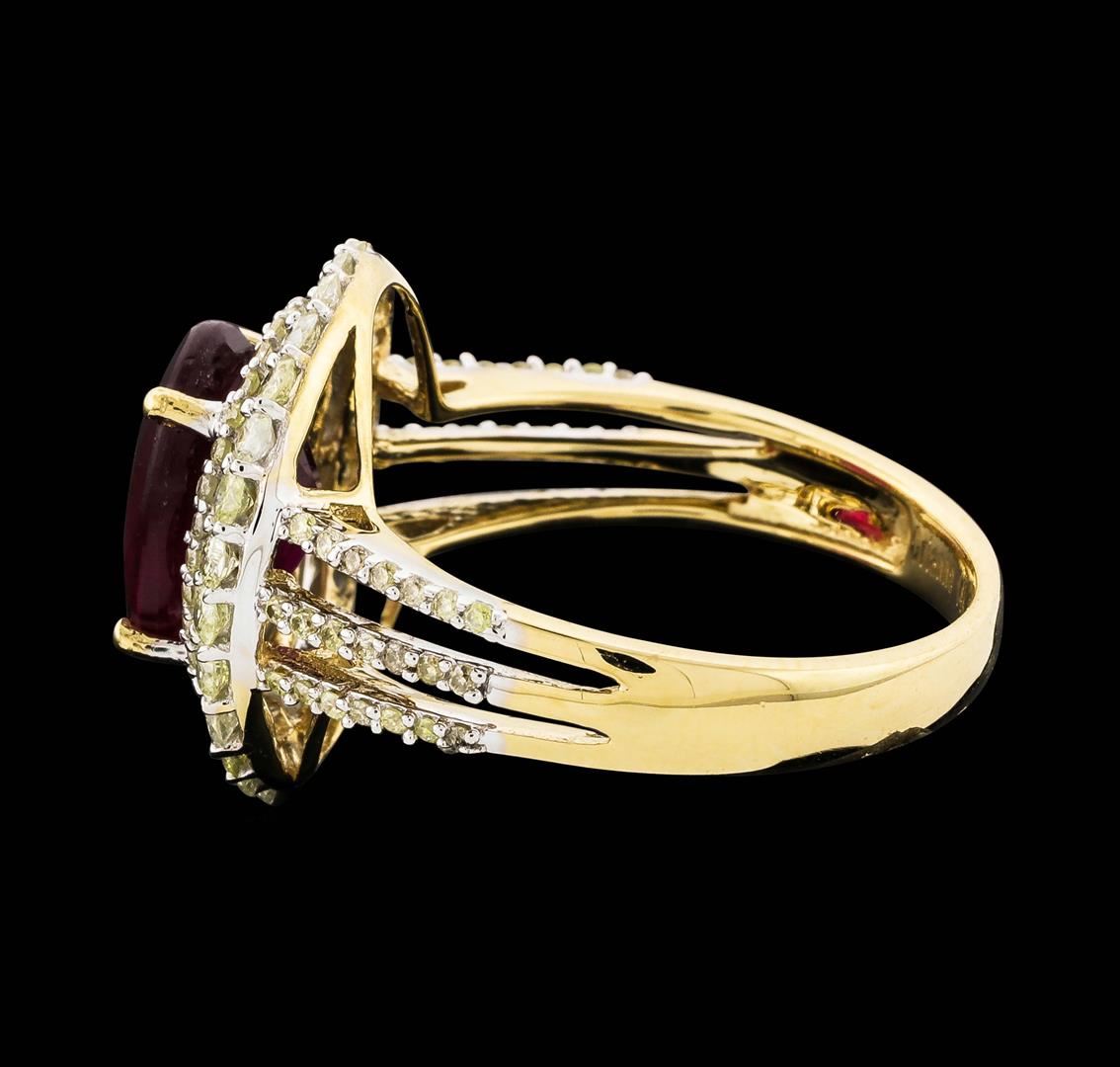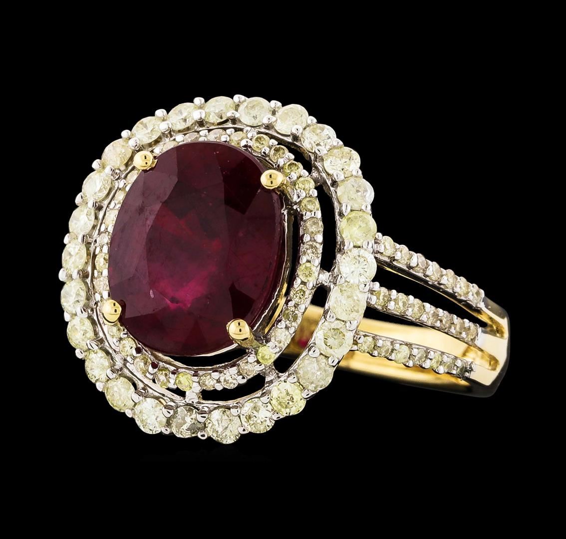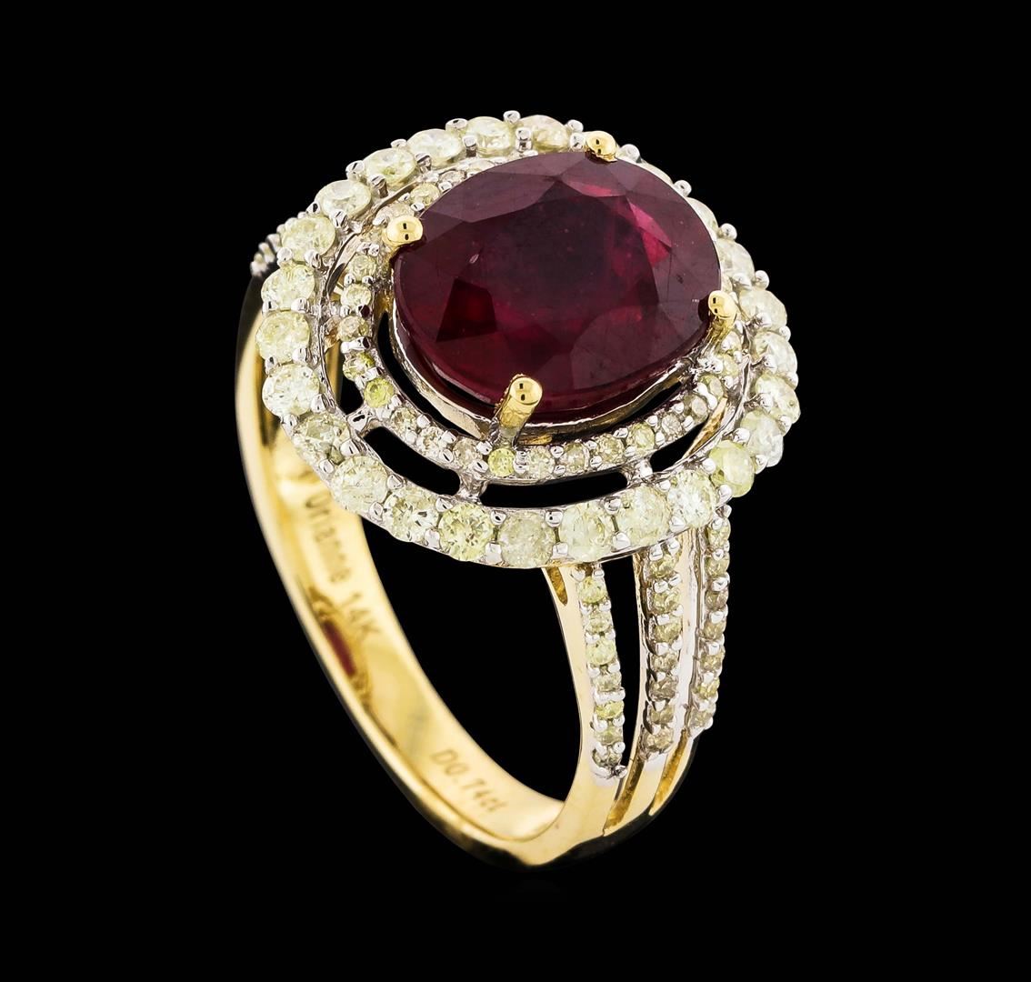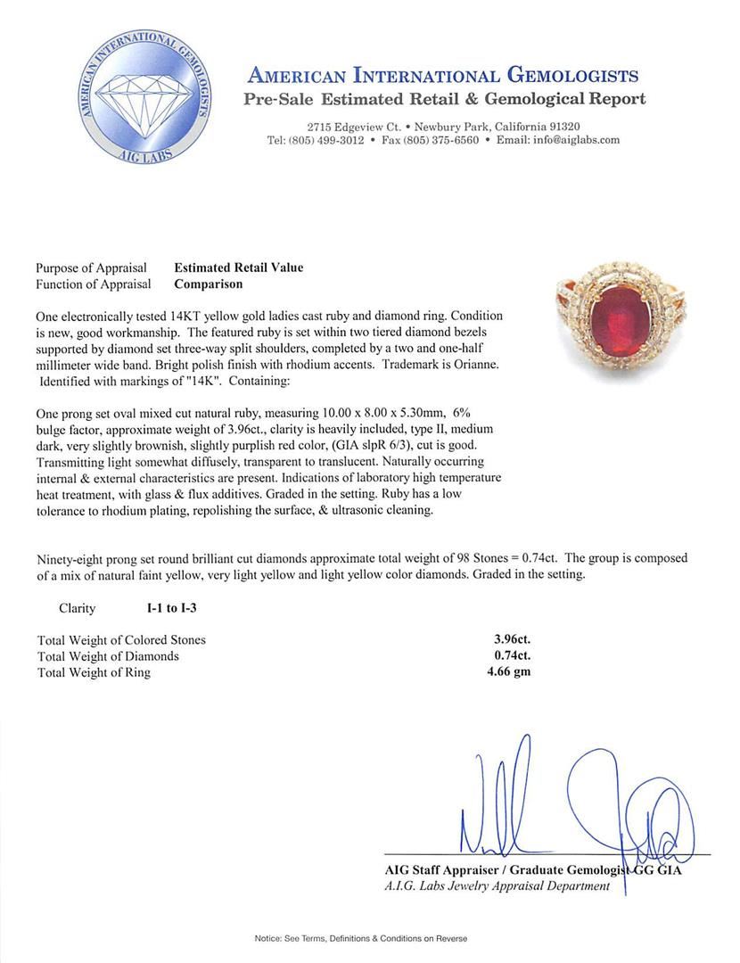 One electronically tested 14KT yellow gold ladies cast ruby and diamond ring. The featured ruby is set within two tiered diamond bezels supported by diamond set three-way split shoulders, completed by a two and one-half millimeter wide band. Bright polish finish with rhodium accents. Trademark is Orianne. Identified with markings of "14K". Condition is new, good workmanship. Containing: One prong set oval mixed cut natural ruby, measuring 10.00 x 8.00 x 5.30mm, 6%. bulge factor, approximate weight of 3.96ct., clarity is heavily included, type II, medium dark, very slightly brownish, slightly purplish red color, (GIA slpR 6/3), cut is good. Transmitting light somewhat diffusely, transparent to translucent. Naturally occurring internal & external characteristics are present. Indications of laboratory high temperature heat treatment, with glass & flux additives. Graded in the setting. Ruby has a low tolerance to rhodium plating, repolishing the surface, & ultrasonic cleaning. Ninety-Eight prong set round brilliant cut diamonds approximate total weight of 98 Stones = 0.74ct. The group is composed of a mix of natural faint yellow, very light yellow and light yellow color diamonds. Graded in the setting. Clarity: I-1 to I-3. Total Weight of Colored Stones 3.96ct. Total Weight of Diamonds 0.74ct. Total Weight of Ring 4.66gm. AIG Appraised.