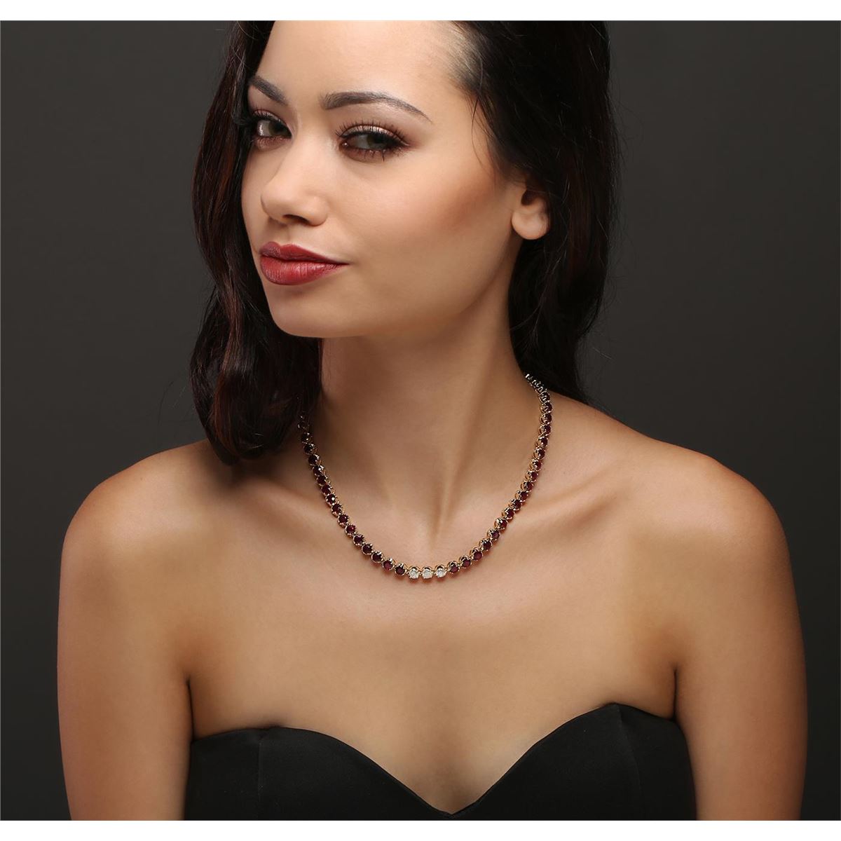 One electronically tested 14KT yellow gold ladies combination cast & assembled ruby and diamond necklace with a hidden box clasp with a bright polish finish. Measurements: 17" in length. Identified with markings of "14K". Condition is new. Containing: Sixty prong set round modified brilliant cut natural rubies, measuring 5.00 - 5.00 x 3.25 mm, approximate total weight of 30.00ct., clarity is heavily included, medium dark, moderately strong, strongly purplish red color, (GIA stpR 6/4), cut is good. Three prong set round brilliant cut diamonds, measuring 5.00 - 5.00 x 3.00mm (depth est.) approximate total weight of 3 Stones = 1.37ct. Clarity: I-3. Color: H, Cut is Good. Colored gemstones are presumed to have been subjected to commonly used enhancement processes. All diamonds and colored gemstones are graded in the mounting, unless otherwise stated. Total Weight of Colored Stones 30.00ct. Total Weight of Diamonds 1.37ct. Total Weight of Necklace 44.90 grams. GGL Appraised at $25,955.00.