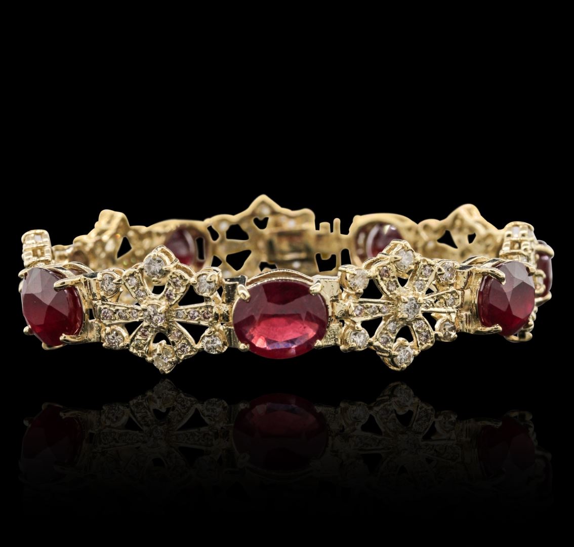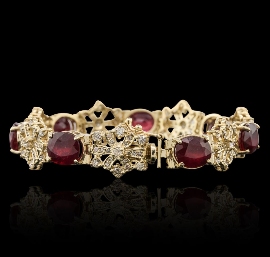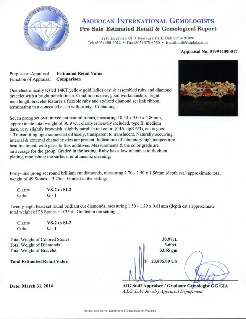 One electronically tested 14KT yellow gold ladies cast & assembled ruby and diamond bracelet with a bright polish finish. Condition is new, good workmanship. Eight inch length bracelet features a flexible ruby and stylized diamond set link ribbon, terminating in a concealed clasp with safety. Containing: Seven prong set oval mixed cut natural rubies, measuring 10.50 x 9.00 x 5.80mm, approximate. Total Weight of 30.97ct., clarity is heavily included, type II, medium dark, very slightly brownish, slightly purplish red color, (GIA slpR 6/3), cut is good. Transmitting light somewhat diffusely, transparent to translucent. Naturally occurring internal & external characteristics are present. Indications of laboratory high temperature heat treatment, with glass & flux additives. Measurements & the color grade are an average for the group. Graded in the setting. Ruby has a low tolerance to rhodium plating, repolishing the surface, & ultrasonic cleaning. Forty-Nine prong set round brilliant cut diamonds, measuring 2.70 - 2.50 x 1.56mm (depth est.) approximate. Total Weight of 49 Stones = 3.25ct. Graded in the setting. Clarity: VS-2 to SI-2. Color: G - I Twenty-Eight bead set round brilliant cut diamonds, measuring 1.50 - 1.20 x 0.81mm (depth est.) approximate. Total Weight of 28 Stones = 0.35ct. Graded in the setting. Clarity: VS-2 to SI-2. Color: G - I. Total Weight of Colored Stones 30.97ct. Total Weight of Diamonds 3.60ct. Total Weight of Bracelet 33.65 grams. AIG Appraised at $23,805.00.